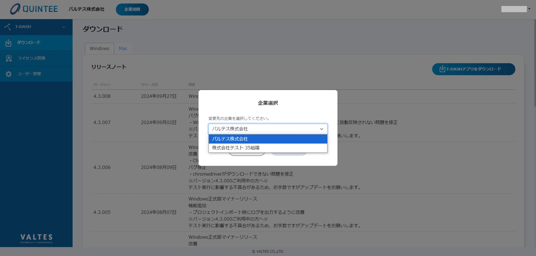 そのため、QUINTEEマイページにて企業切替をおこなった状態でT-DASHを起動しても、切替先の企業ではありません。