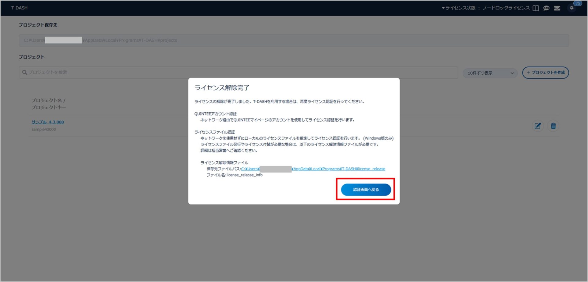 5.ライセンスが解除されました。「認証画面へ戻る」をクリックします。