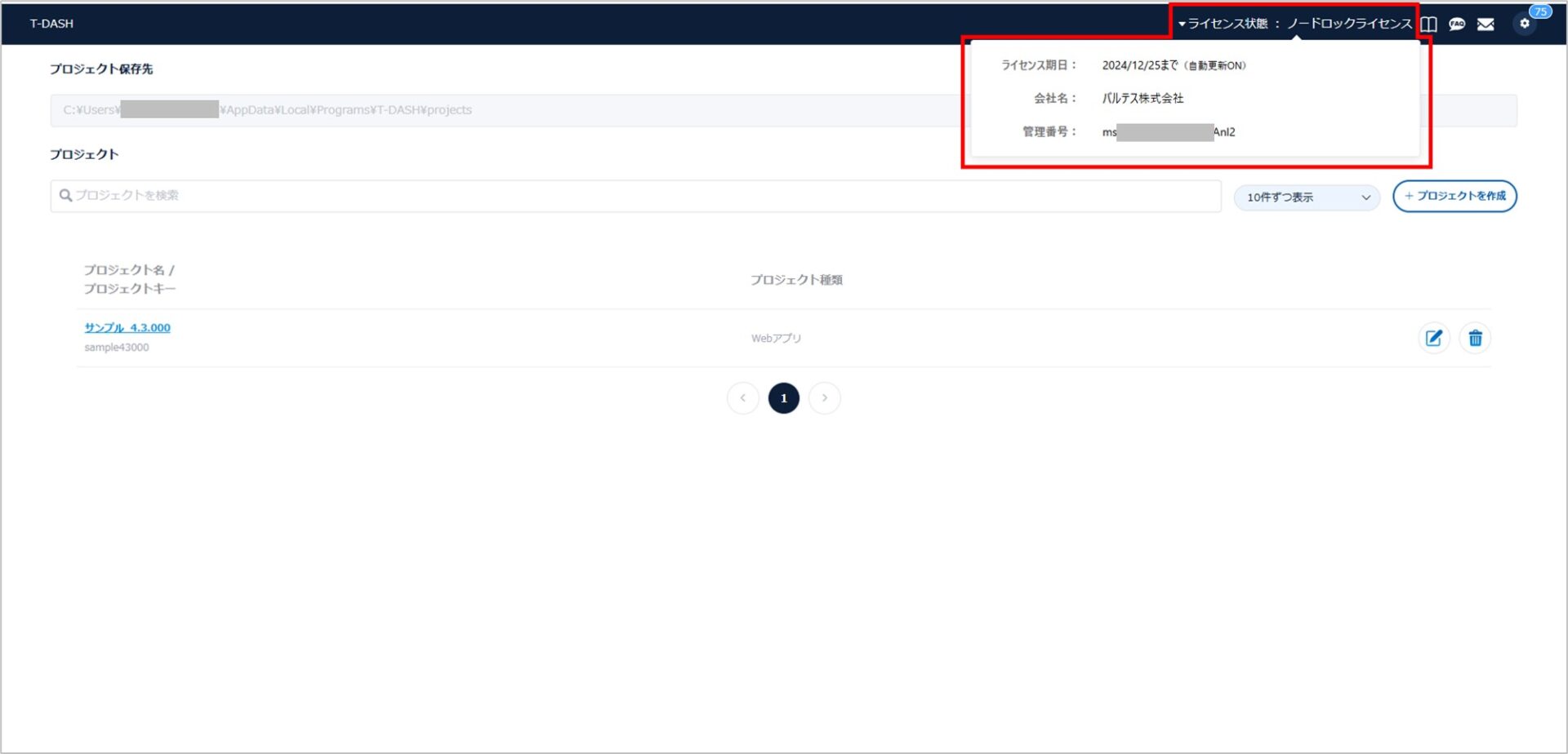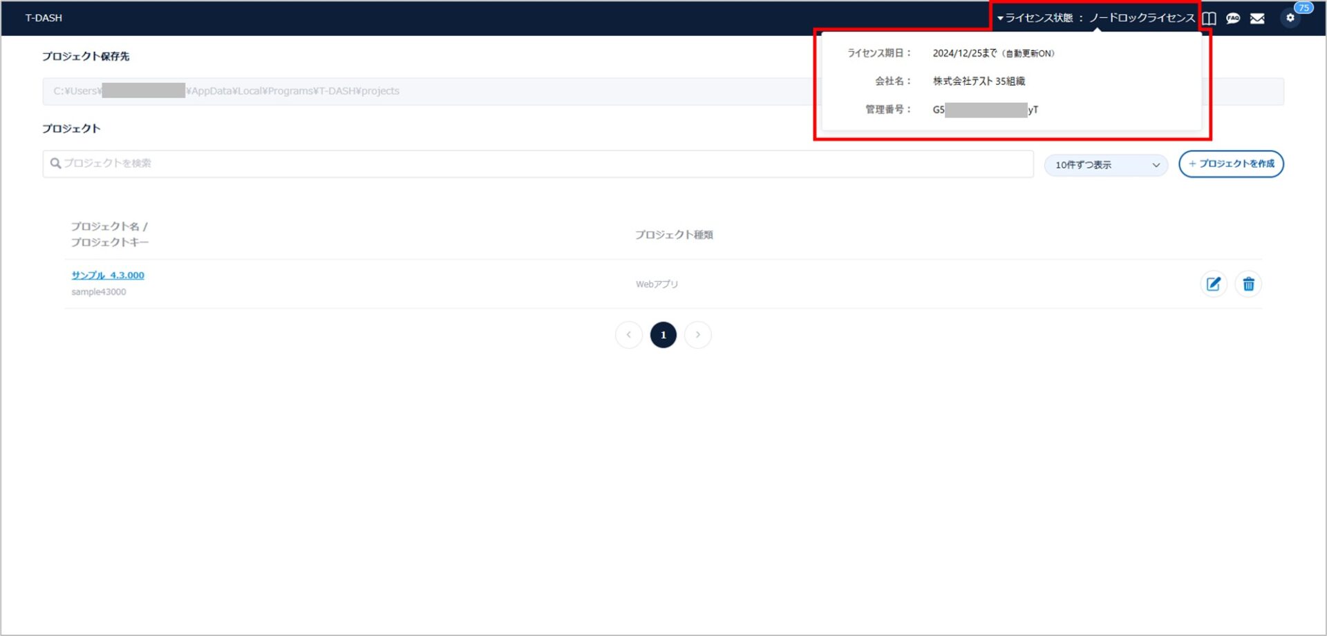 1.T-DASHを起動し、ライセンス情報をクリックすると「ライセンス期日」「企業名」「管理番号」が確認できます。