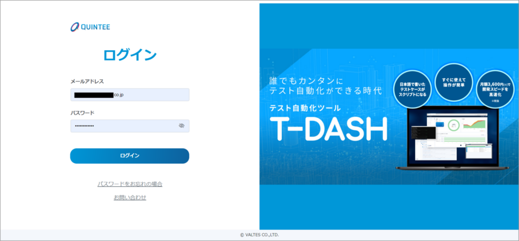 トライアルお申込み時に発行するQUINTEEアカウントと初期パスワード、またはQUINTEEマイページから発行したアカウントからログインできます。