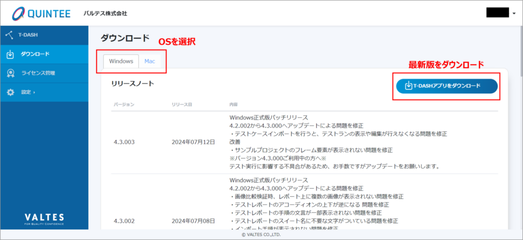 ダウンロードするOSを選択し、「T-DASHアプリをダウンロード」ボタンをクリックしてダウンロードします。
