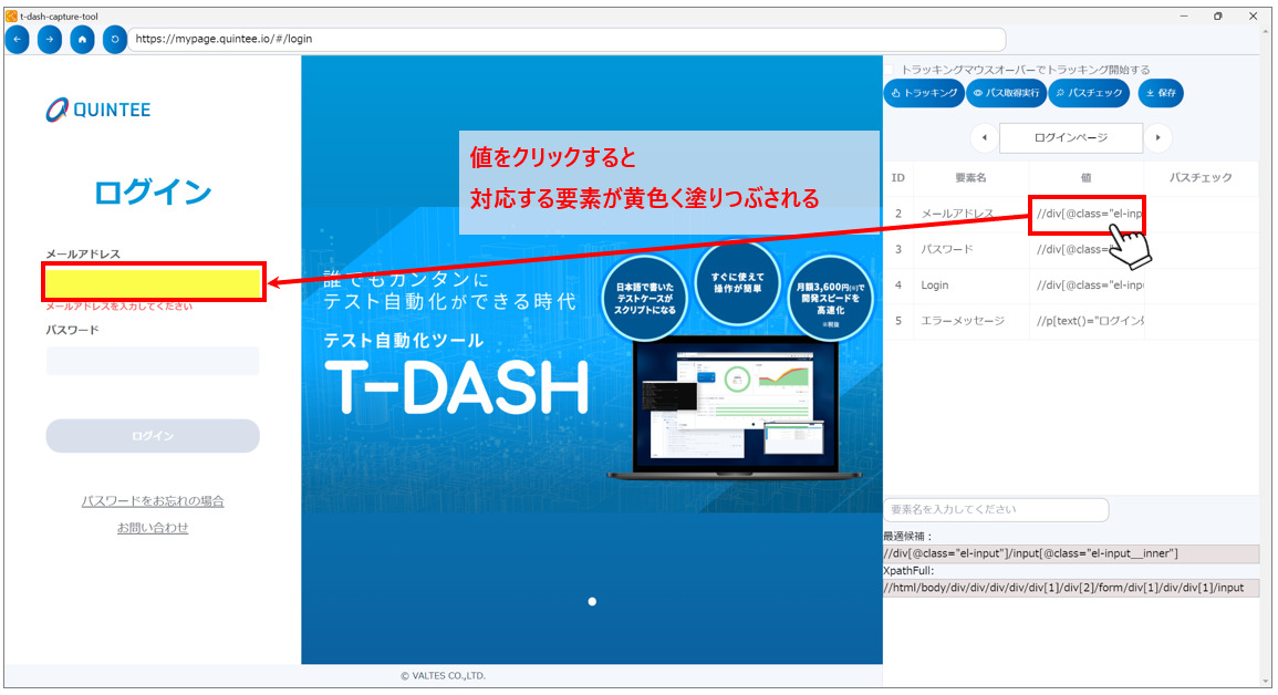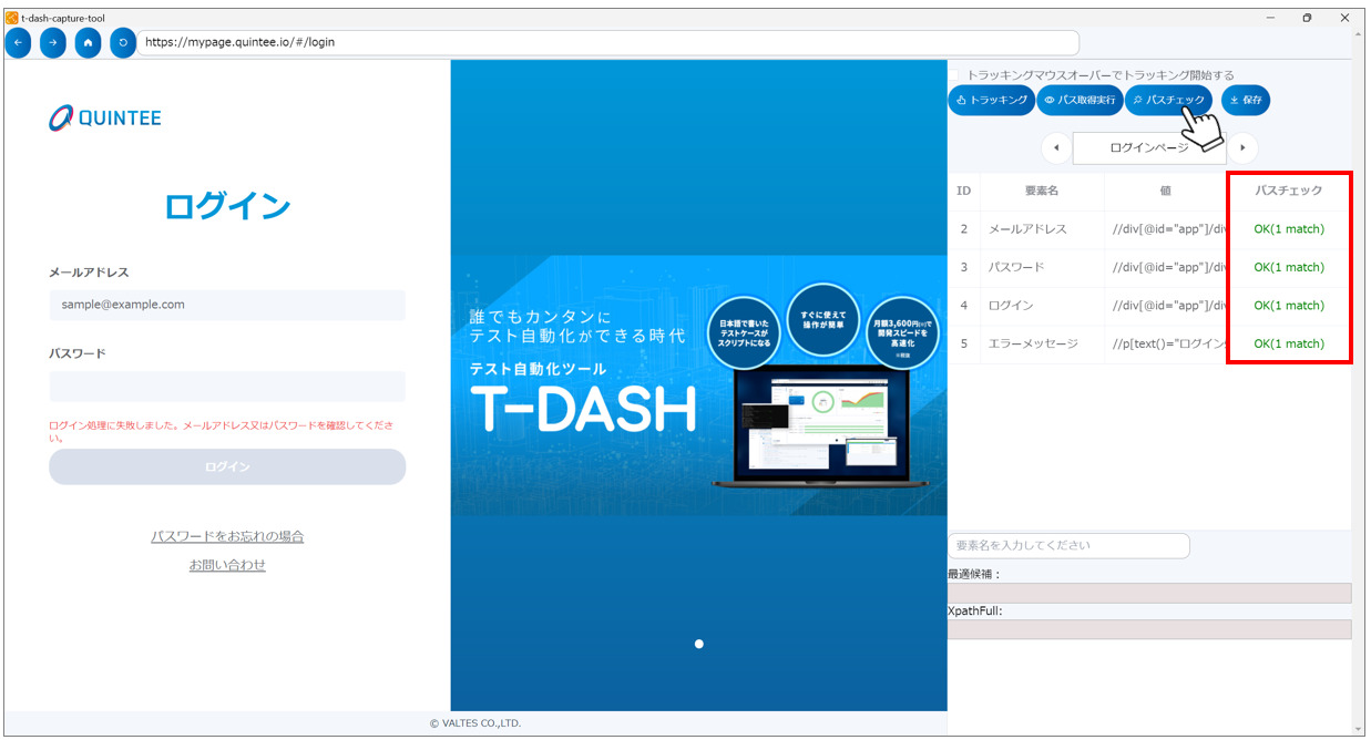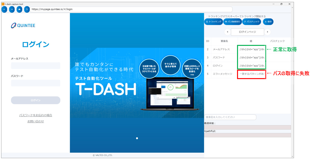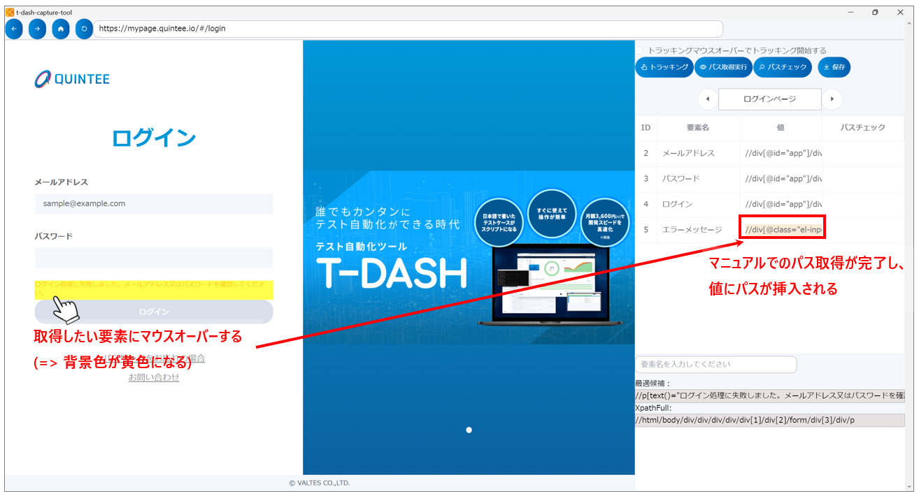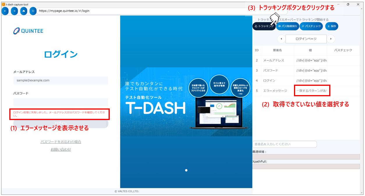 ※ 今回のケースでは、事前に左エリアでログインに失敗するメールアドレスとパスワードでログインを試み、エラーメッセージを表示させておく必要があります