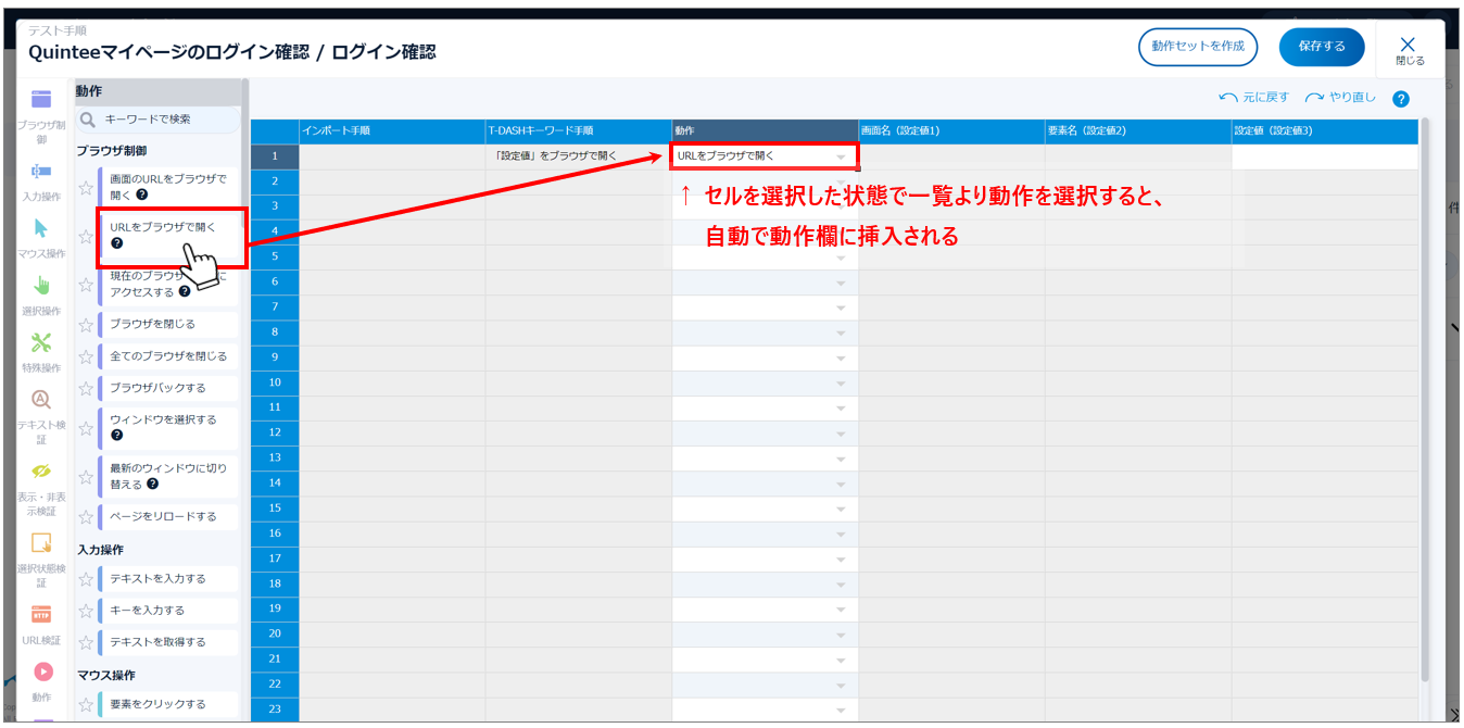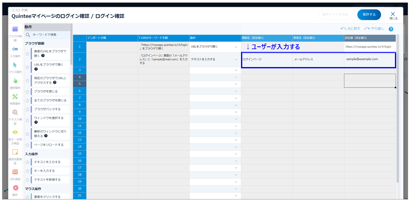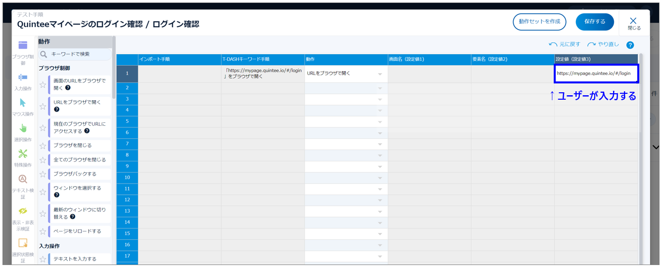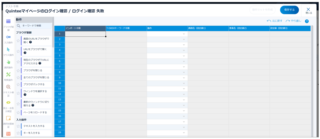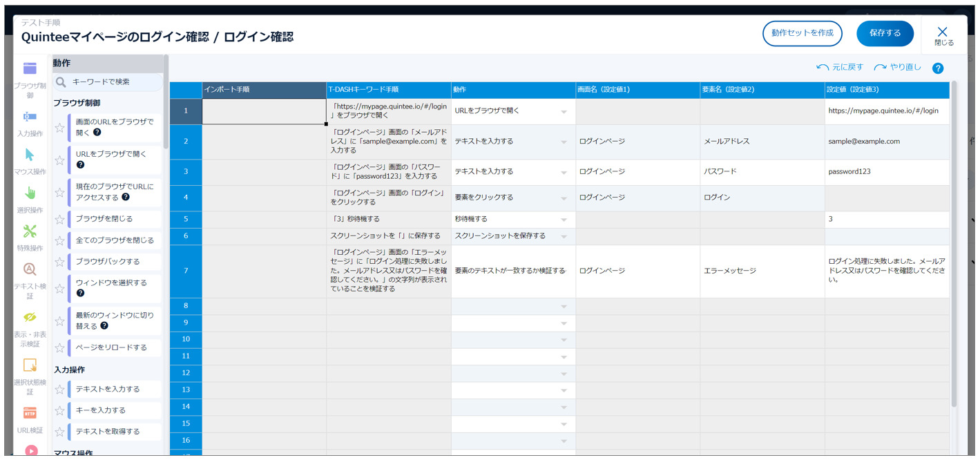 2.6. テスト手順画面にて、「動作」「画面名(設定値1)」「要素名(設定値2)」「設定値(設定値3)」を入力する