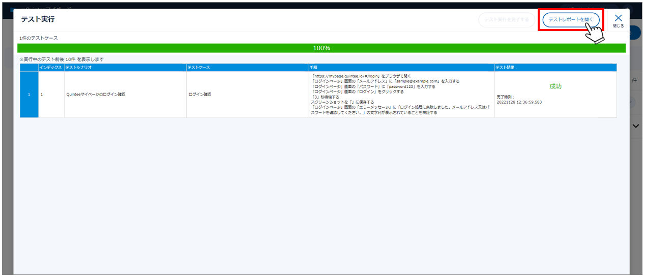 4.5. テスト実行が完了すると、「テストレポートを開く」ボタンが活性化する
