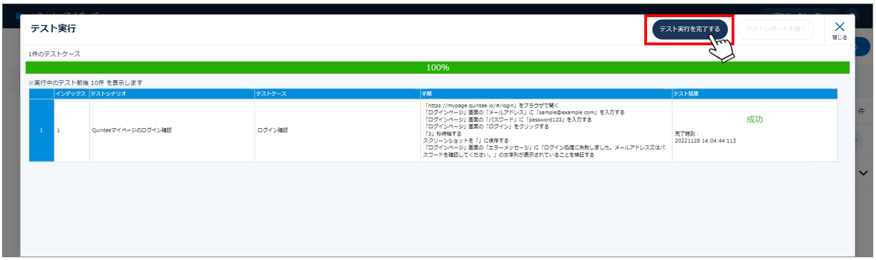 ※ テスト実行を完了するボタンをクリックすると、テストが途中終了されます