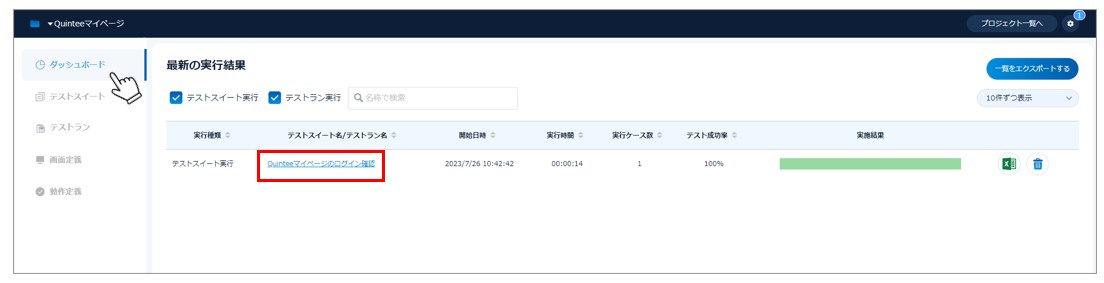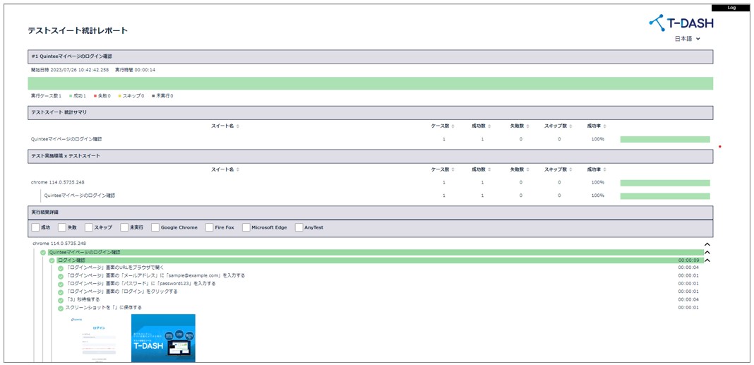 自動テストの実行が完了すると、テストレポートが自動で作成されます。テストレポートは、実行完了後の画面とダッシュボードの2画面より確認できます。