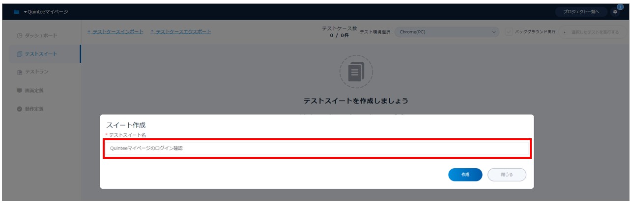 2.2. 任意のテストスイート名を入力し、作成ボタンをクリックする
