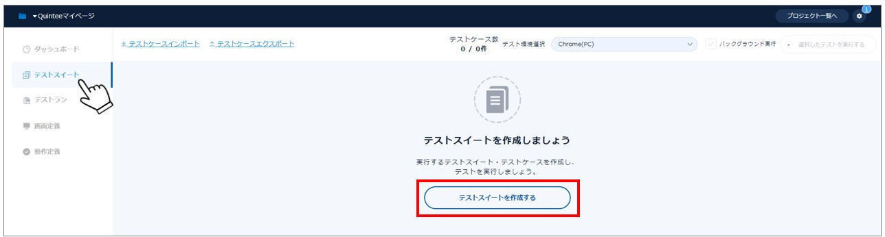 2.1. サイドメニューから、テストスイートを選択、「テストスイートを作成する」ボタンをクリックする