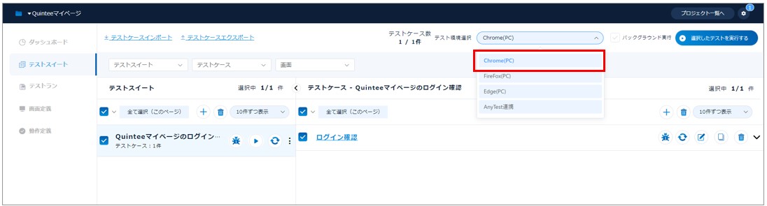 4.2. 「テスト環境選択」リストボックスで、「Chrome」を選択する