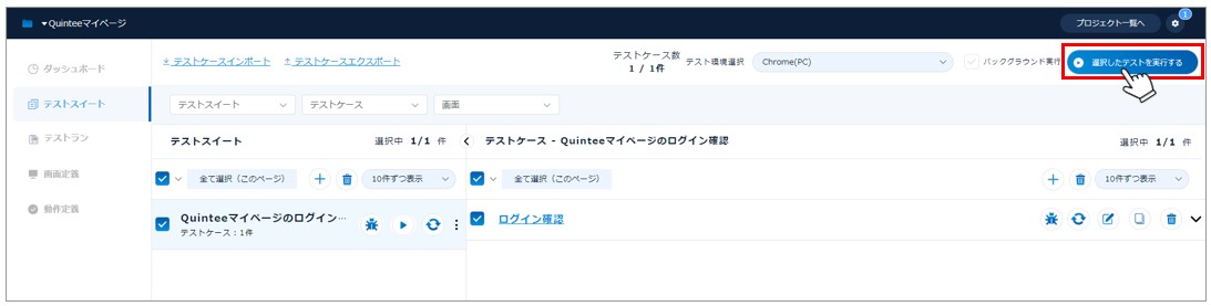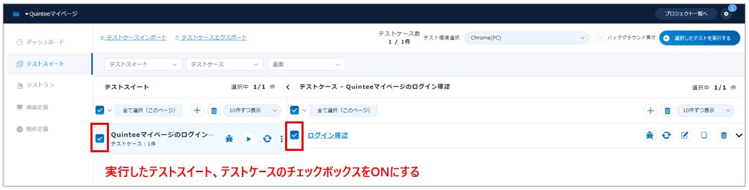 手順2で作成したテストスイート名、テストケース名の左にあるチェックボックスをONにする