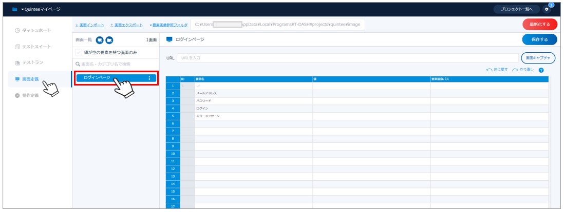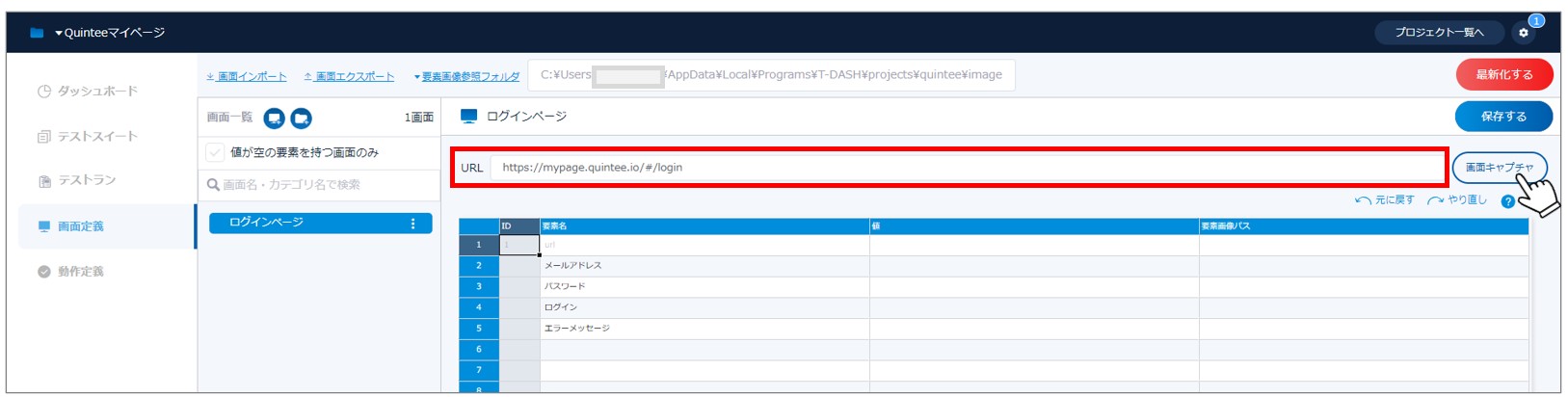 3.2. 「URL」テキストボックスに、QuinteeマイページのURL「https://mypage.quintee.io/#/login」を入力し、「画面キャプチャ」ボタンをクリックする
