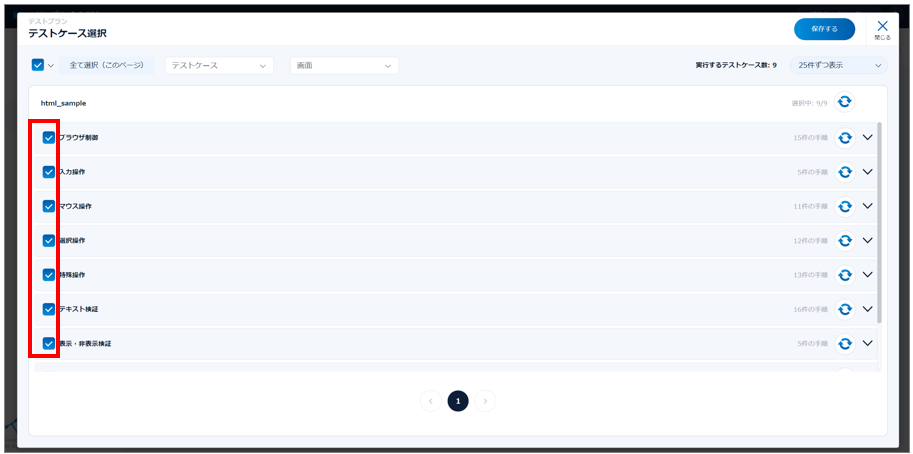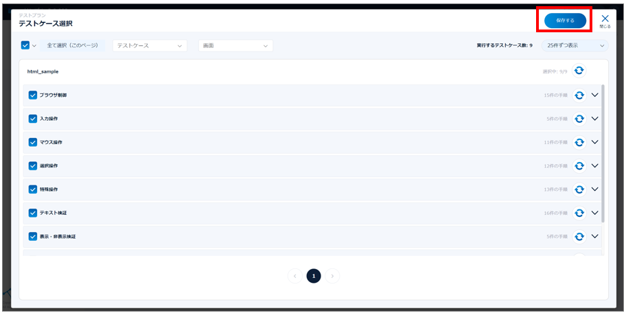 3. 「テストケース選択」画面にて、「保存する」ボタンを押下します