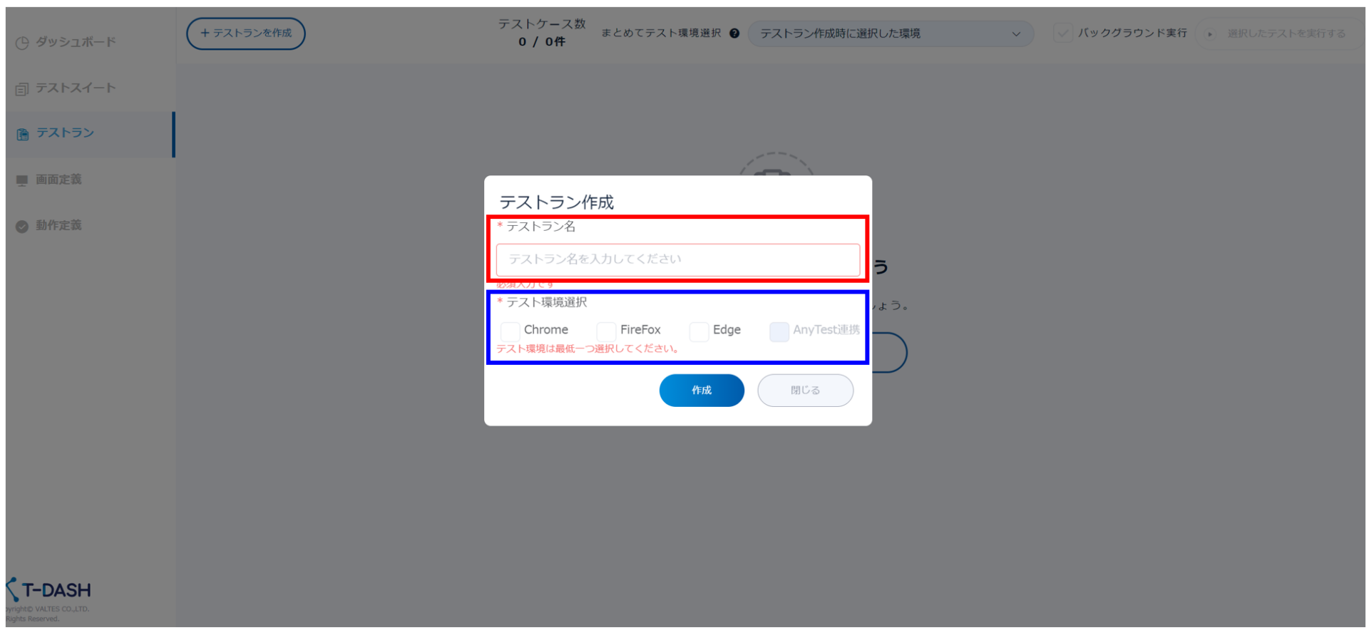 3. 「テストラン作成」画面にて、テストラン名および実行するブラウザを設定します。