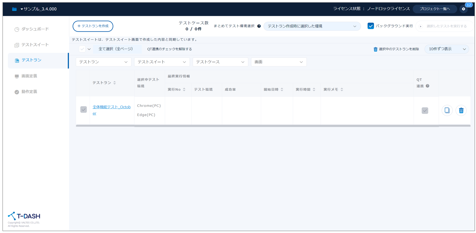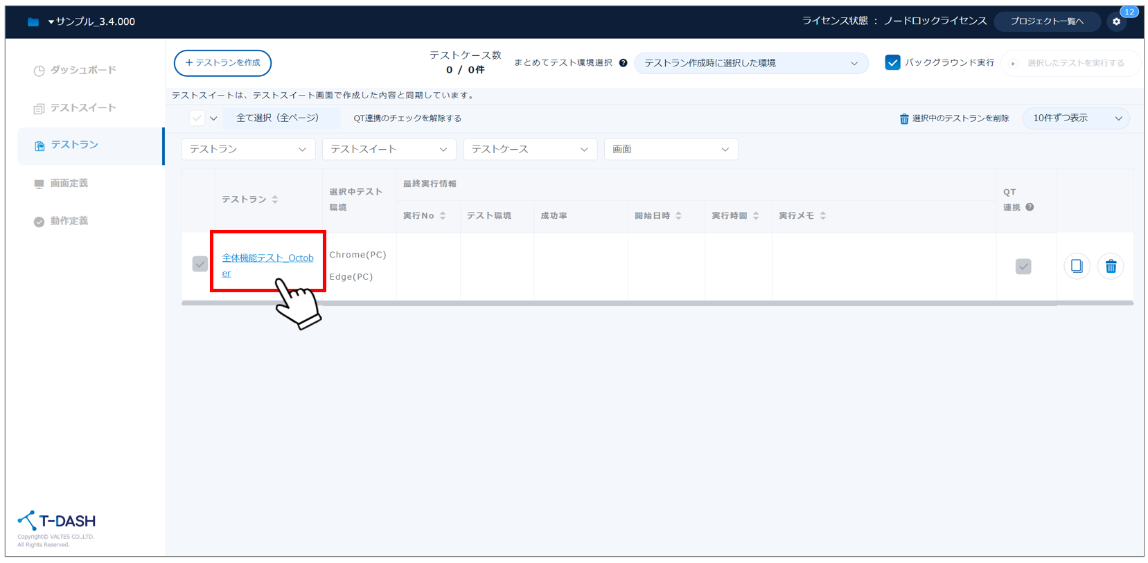4. テストラン画面に手順3で作成したテストラン名が表示されるため、クリックします
