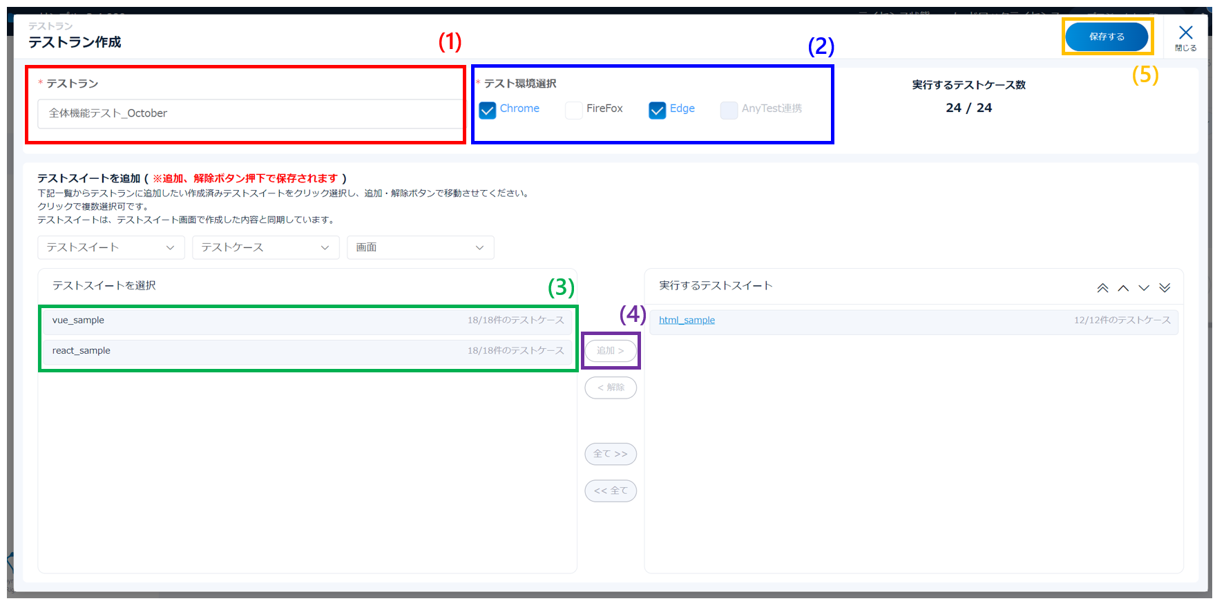 – 「テストスイートを追加」(3):設定中テストランで実行させたいテストスイートを選択し、「追加」ボタン(4)を押下します