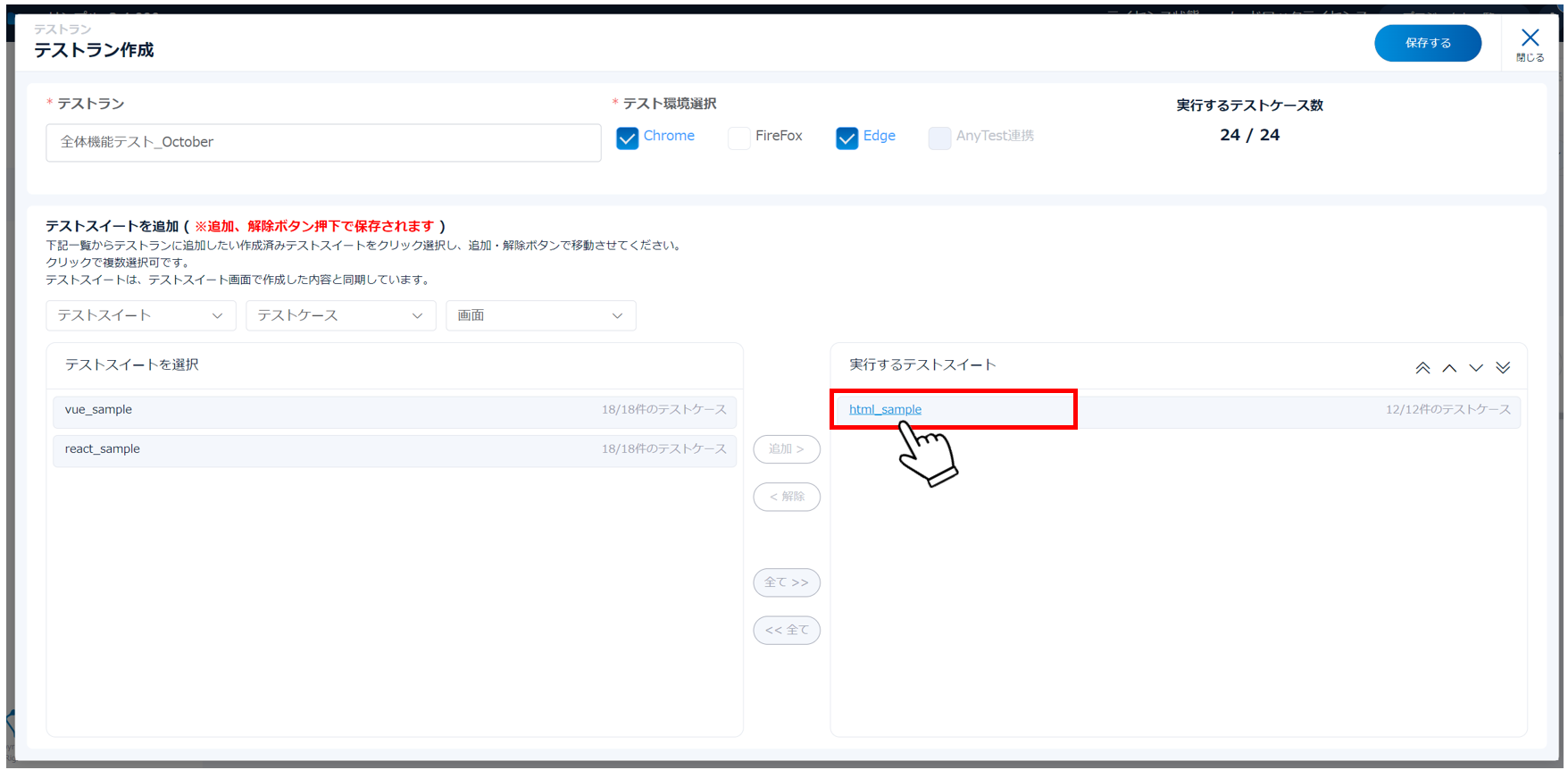 (右側の「実行するテストスイート」に追加したテストスイートが追加されます)