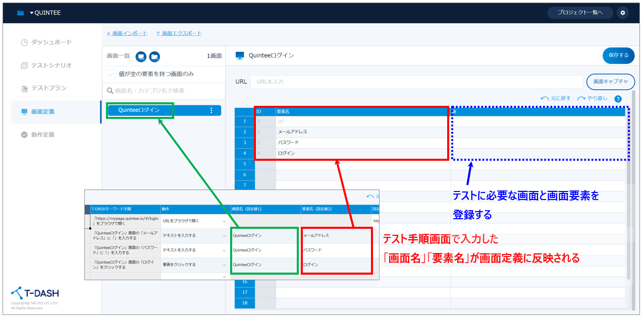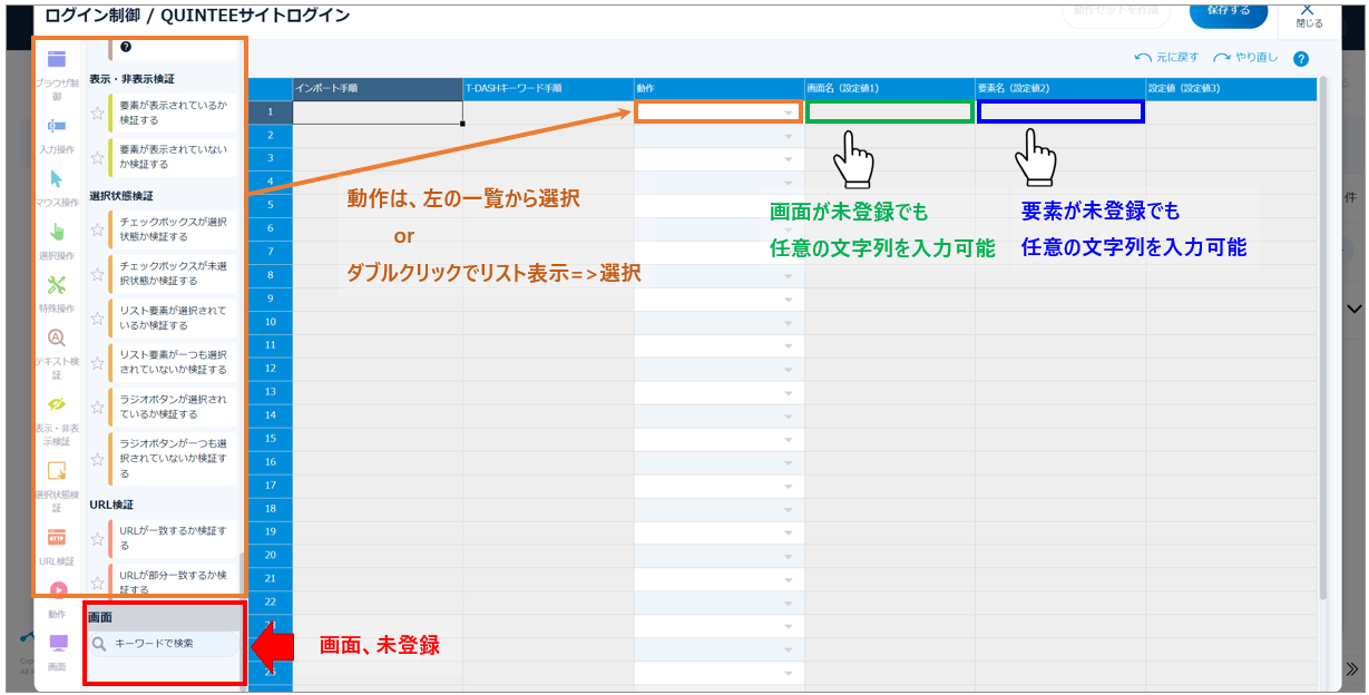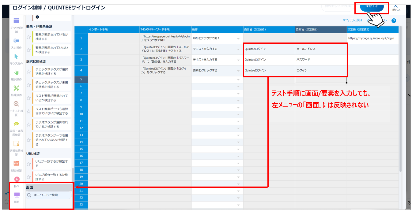 テスト手順にて、画面登録していない名称を「画面名 (設定値1)」に入力すると、自動的に画面一覧に登録されます(画面に紐づく要素名も併せて登録されます)