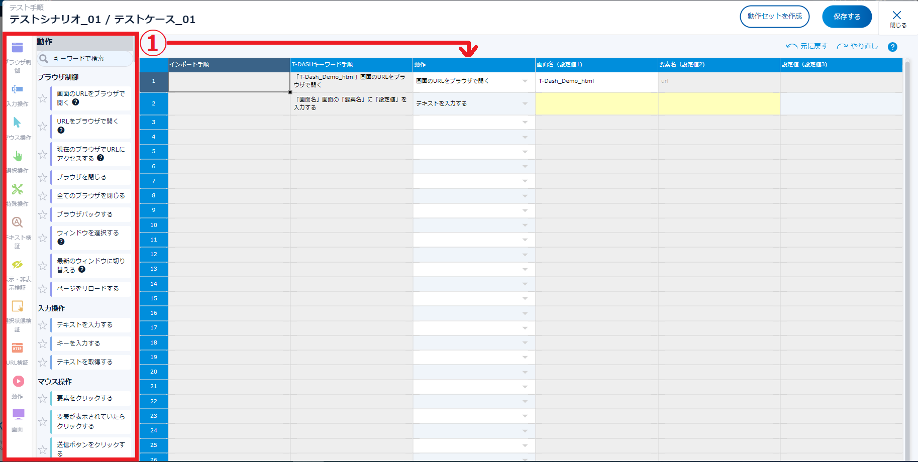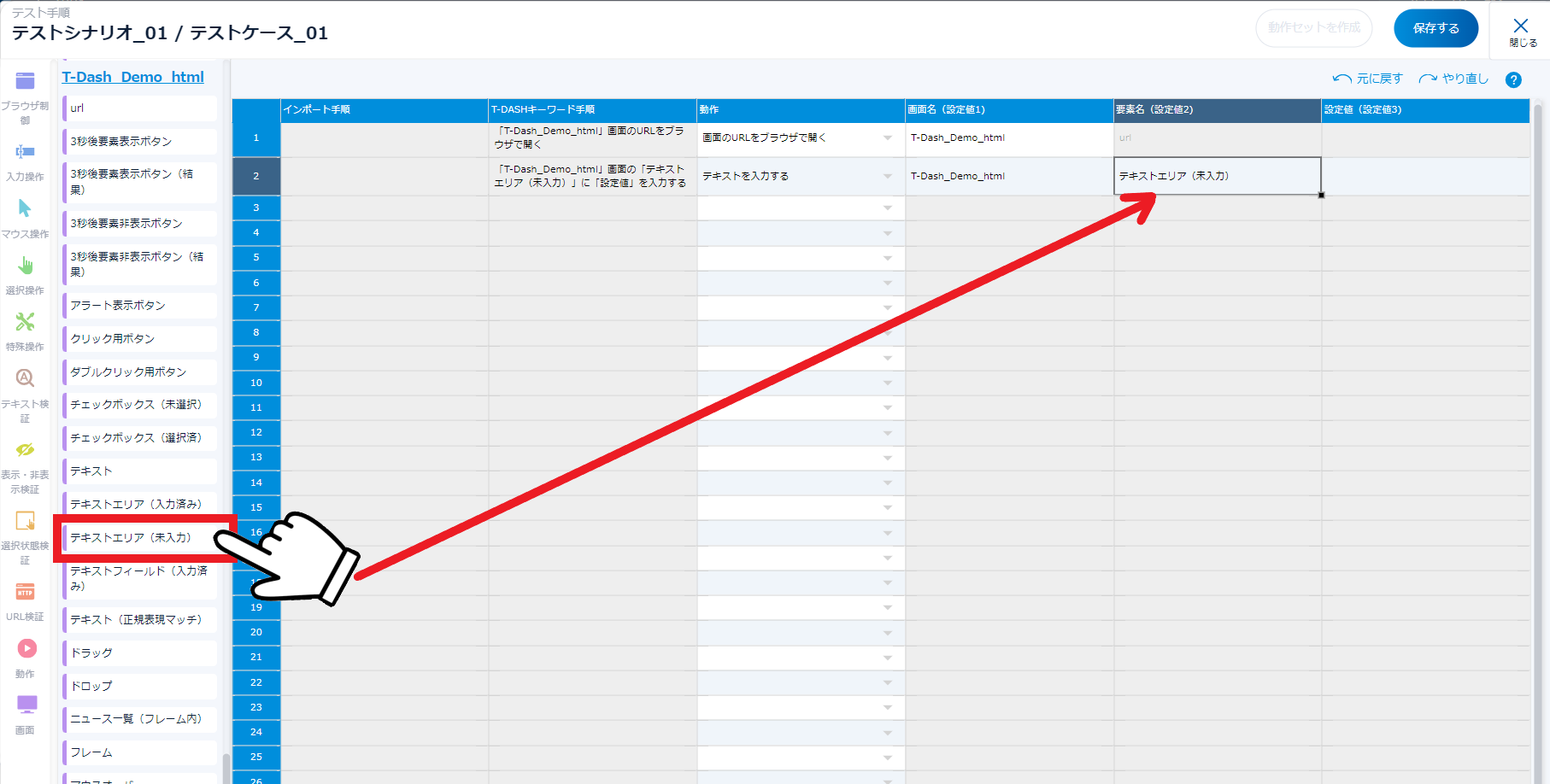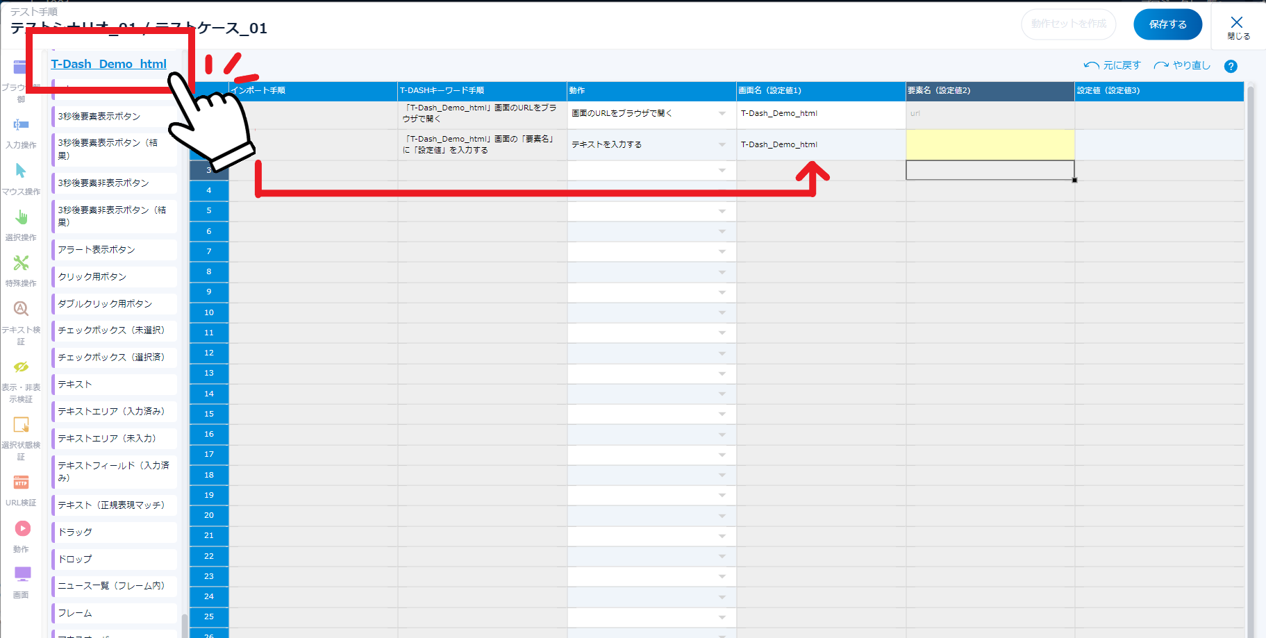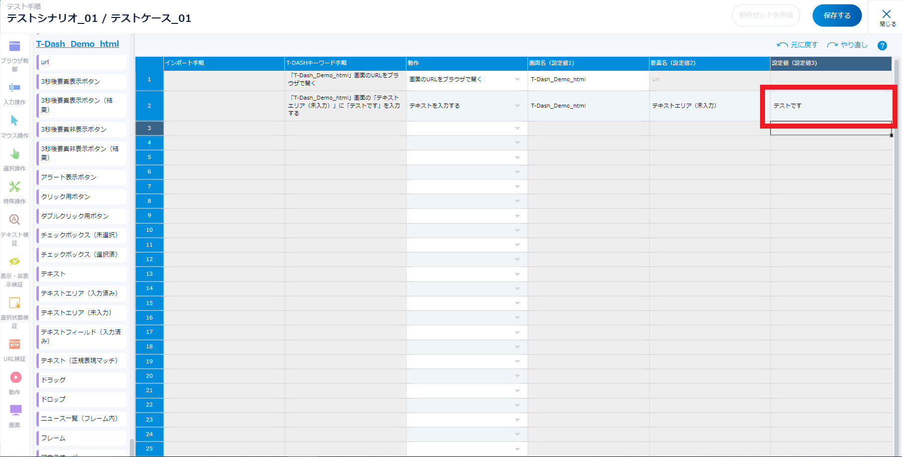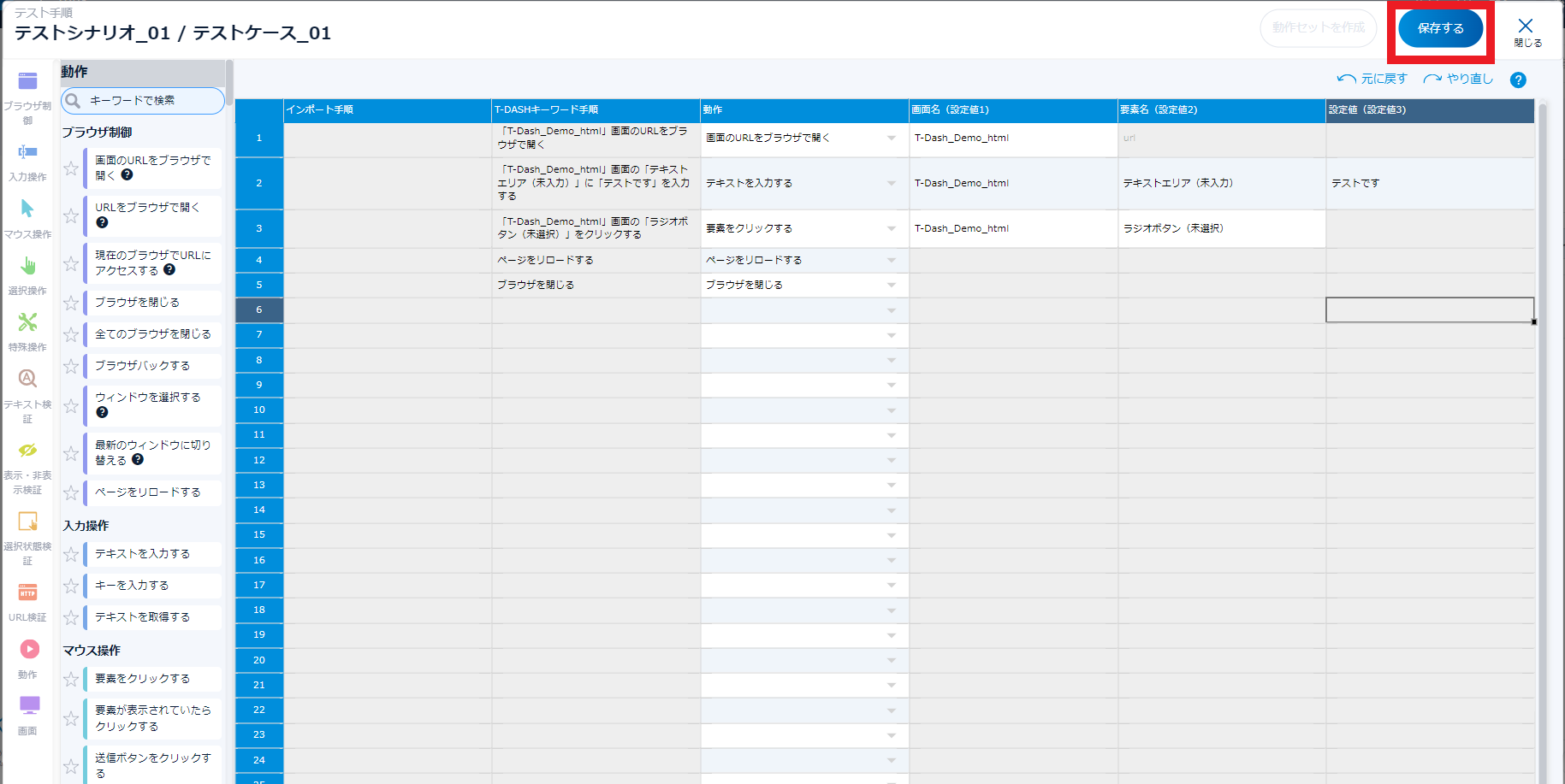 - 手順2~6の作業を繰り返してテストケースを完成させ、最後に「保存する」をクリック