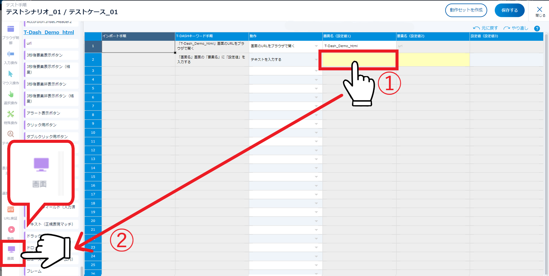 - ①「画面名」のセルをクリックして(黄色が入力可能なセル)