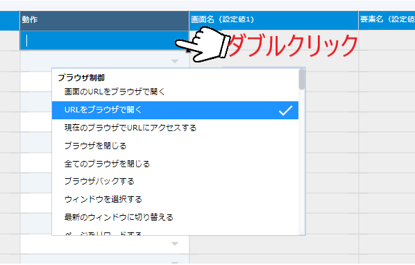 動作名は「動作」セルをダブルクリックしても選択できます