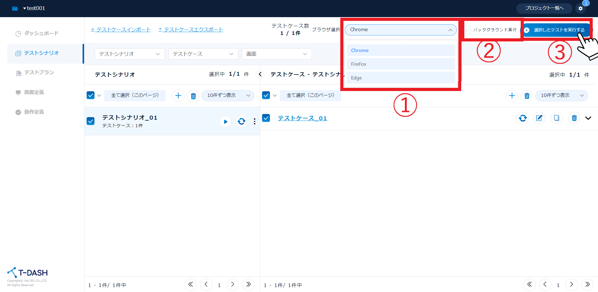 ①実行するブラウザを選択
