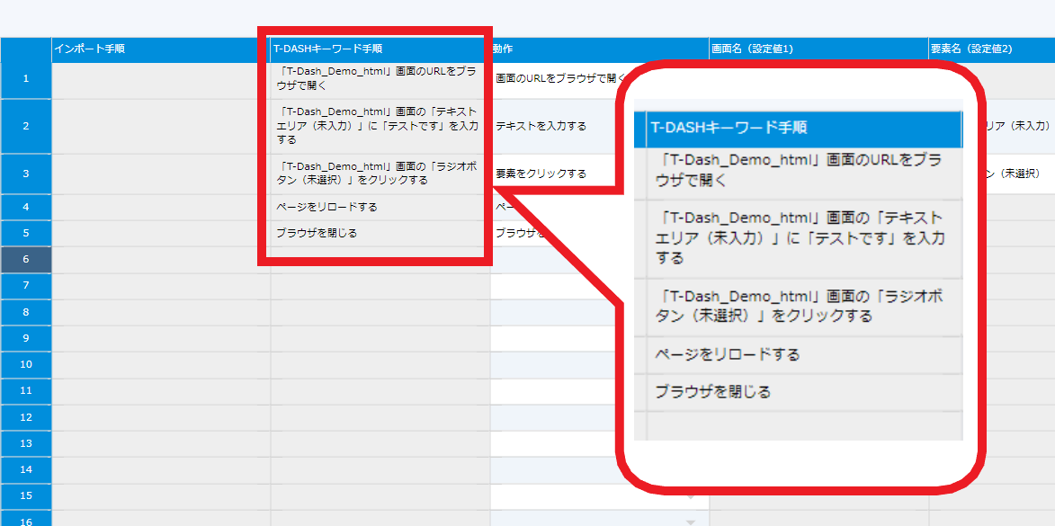 | ➁T-DASHキーワード手順 | テストスクリプト。文章で③から⑥を入力すると自動で作成される |