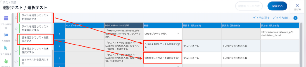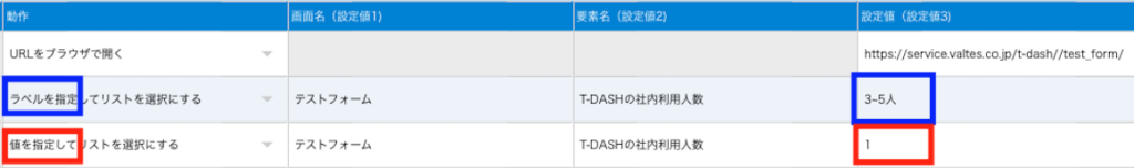 動作について「ラベルを指定してリストを選択にする」、「値を指定してリストを選択にする」を選択して、対象の画面名と要素名を入力します。