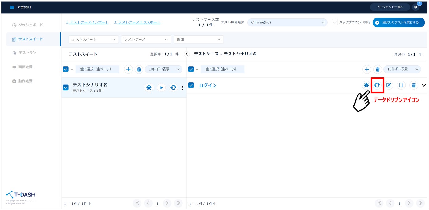 - テストケースの「データドリブンアイコン」をクリック
