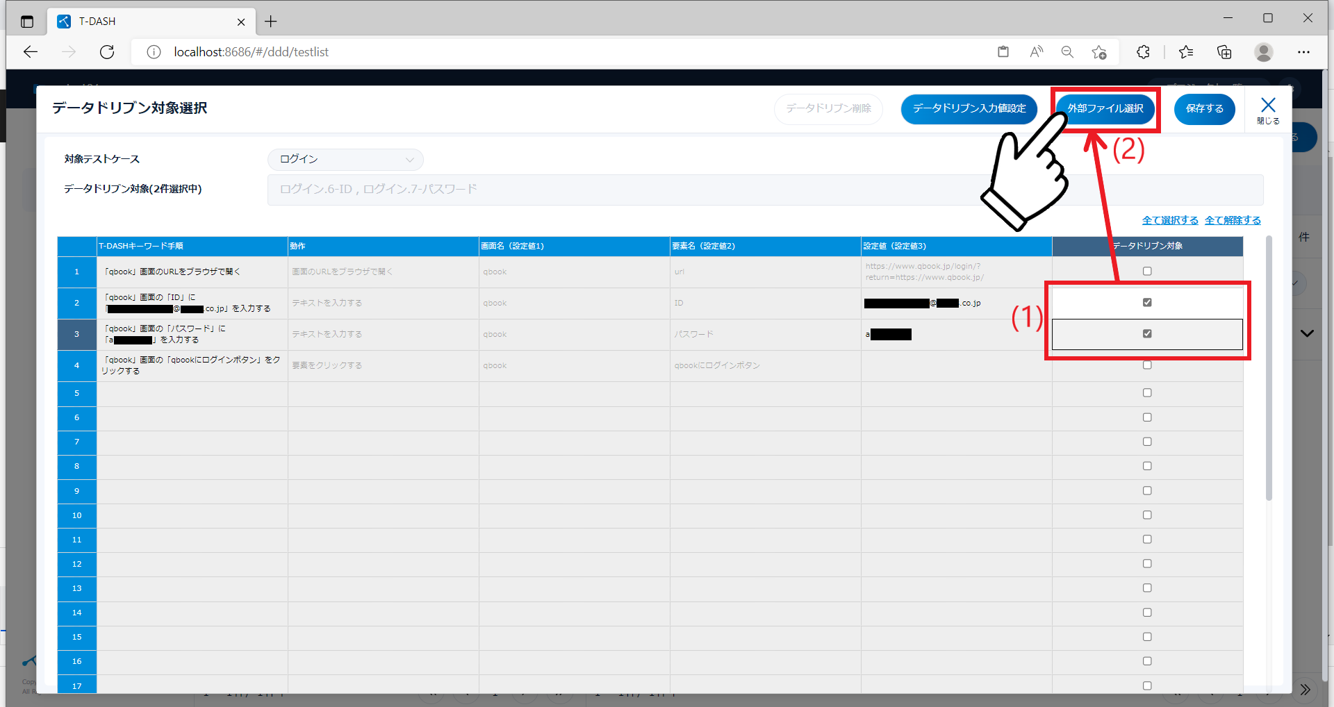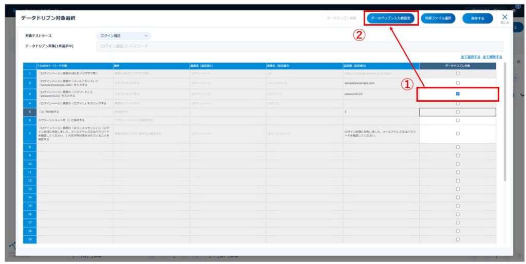 2. (1)反復テストしたい設定値にチェックして、(2)「データドリブン入力値設定」をクリック