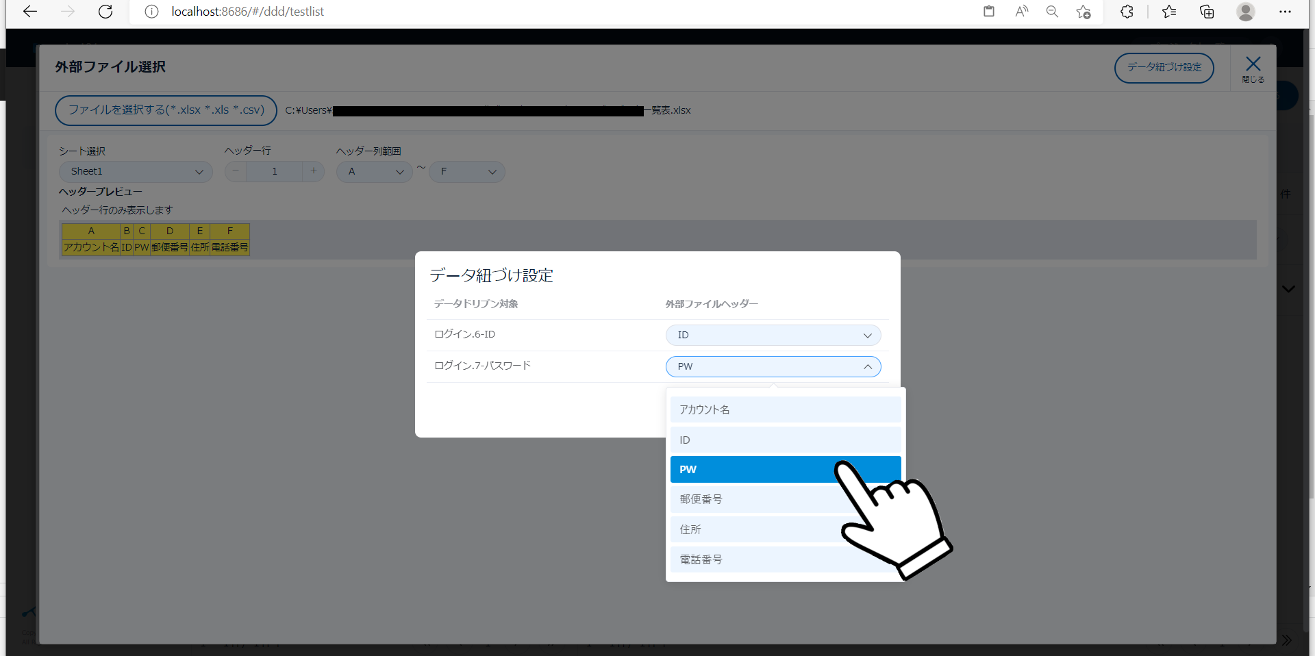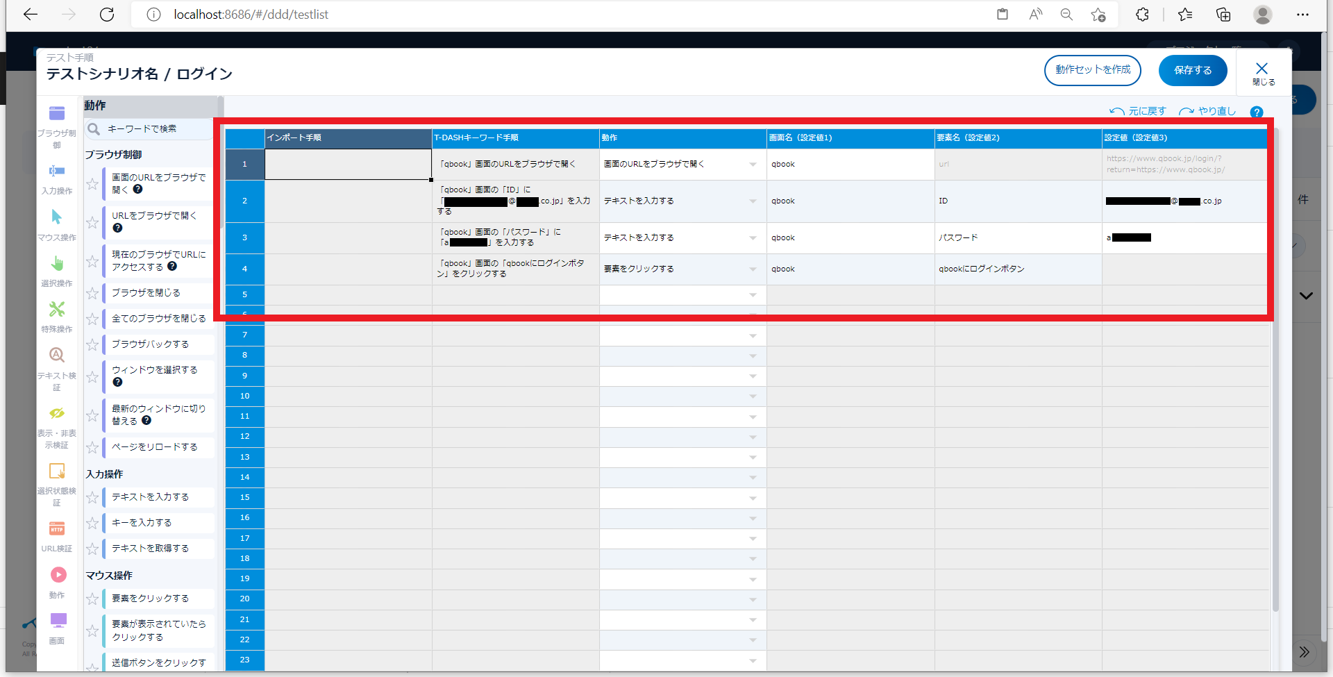 今回は「アカウント名」「パスワード」の一覧が記載された外部データを使って、ログインテストを行う想定です。