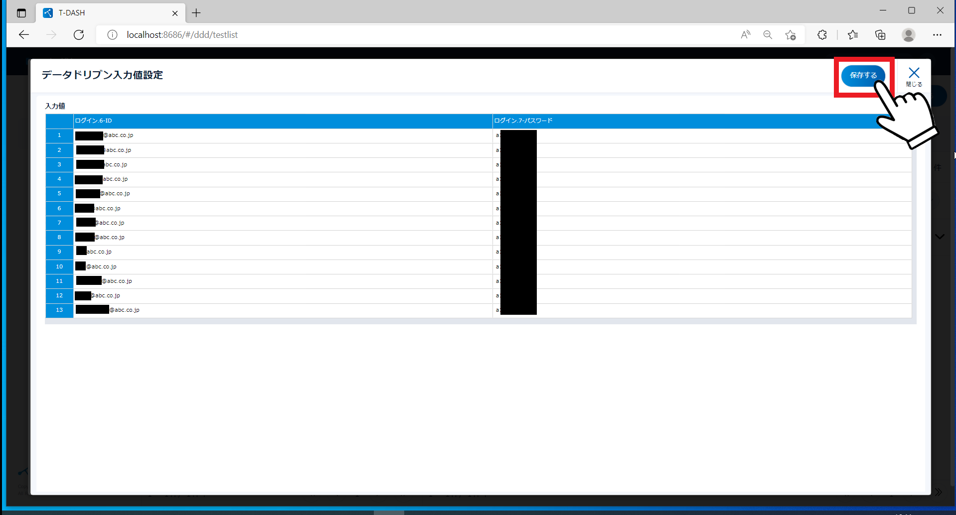 - テストに使用する値がある範囲を指定する(今回はIDとPW列)