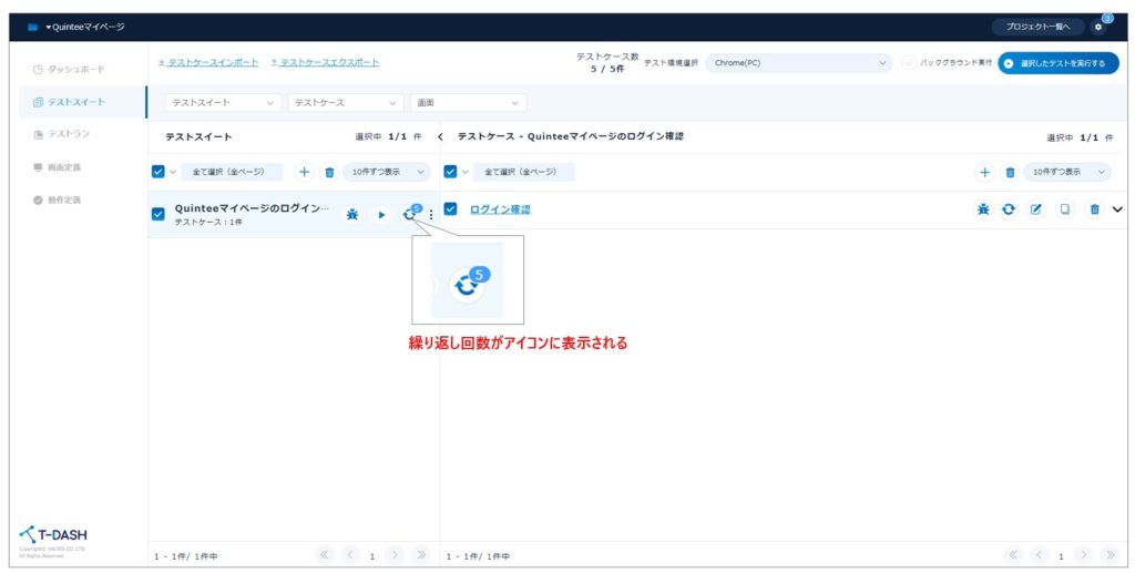 4. テストスイートのデータドリブンアイコンに繰り返し数が表示されることを確認し、