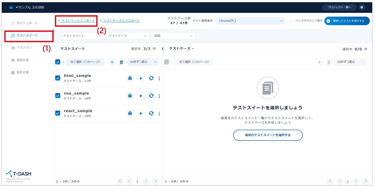- ダッシュボードの「テストスイート」をクリックし、「↓テストケースインポート」をクリックする
