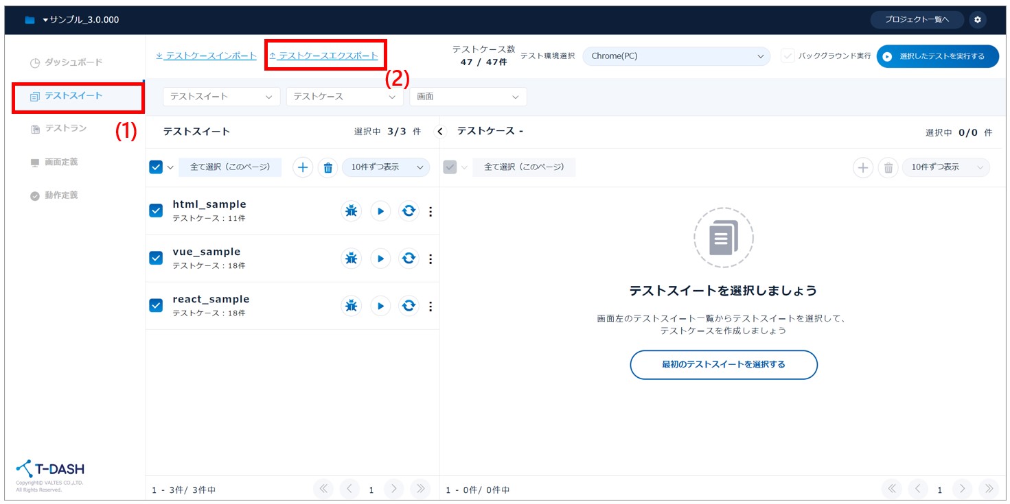 - (1)ダッシュボードの「テストスイート」をクリックし、
