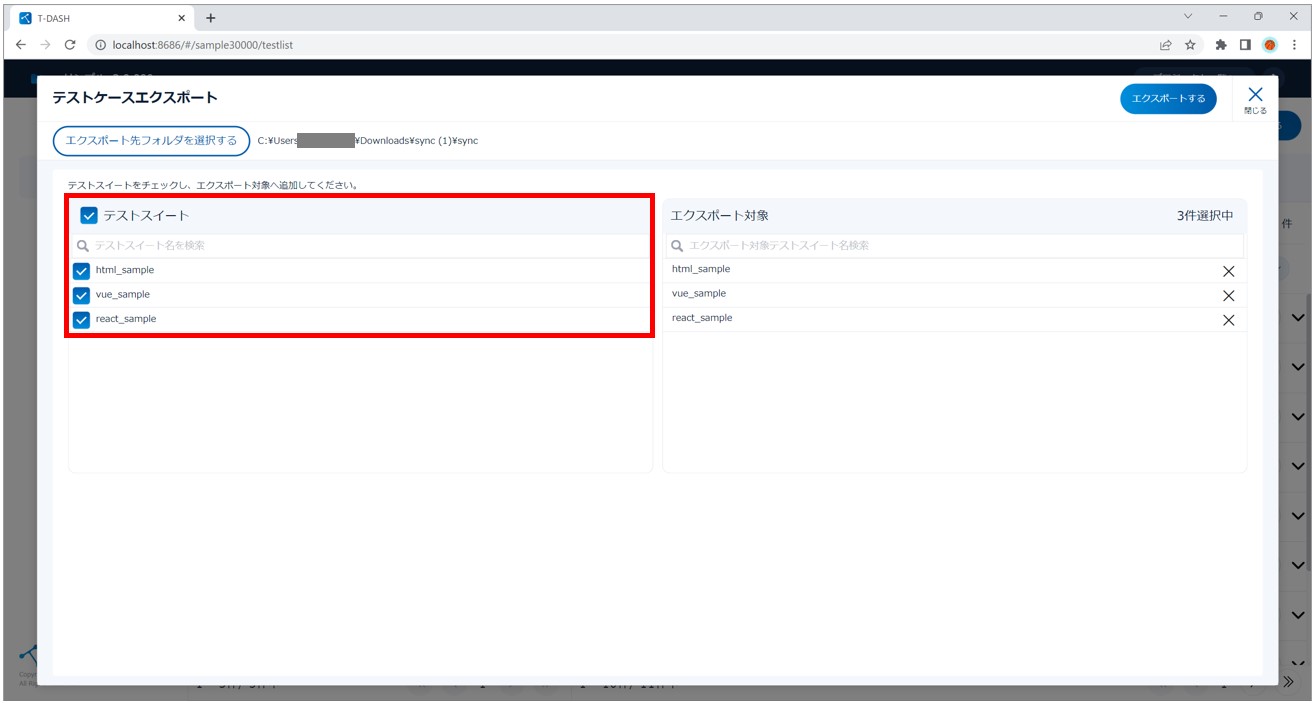 - エクスポート画面が表示されたら、エクスポートしたいテストスイート名にチェックをつける