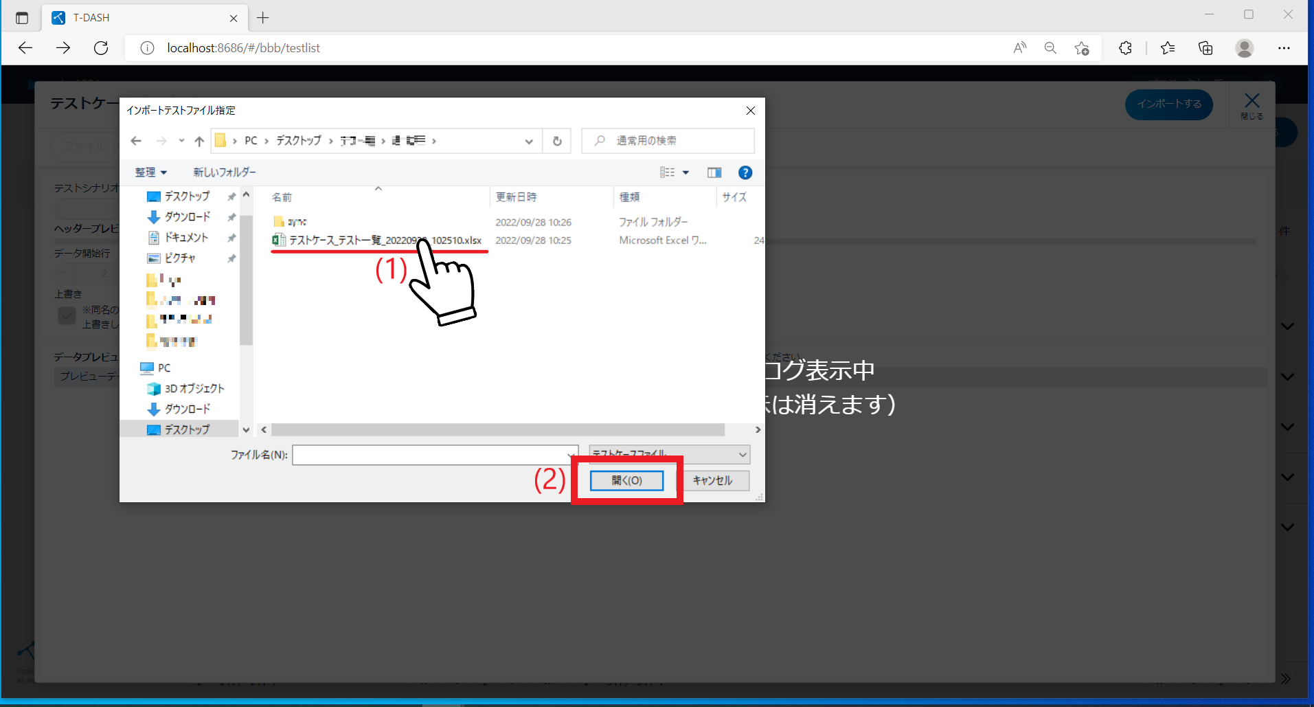- ファイル選択画面でインポート対象ファイルを選択して、「開く」をクリック