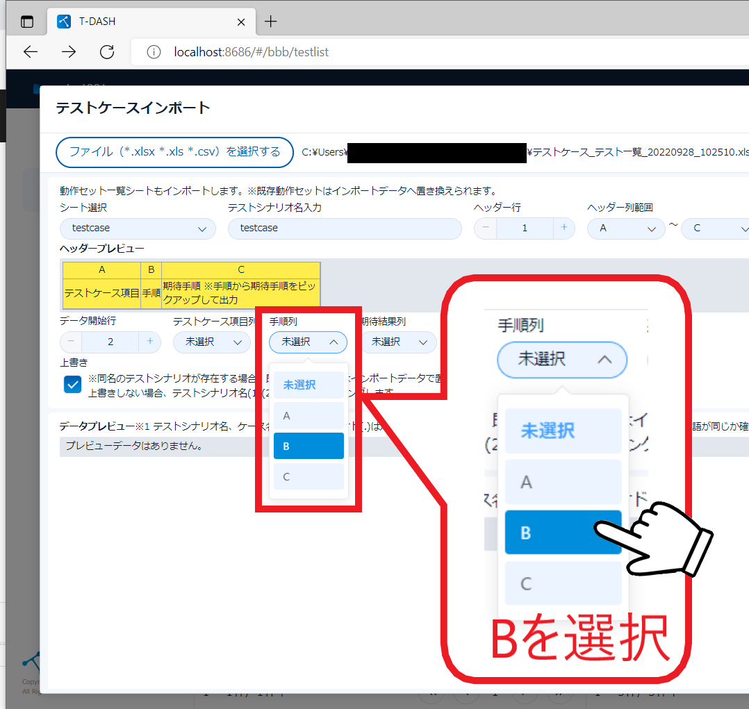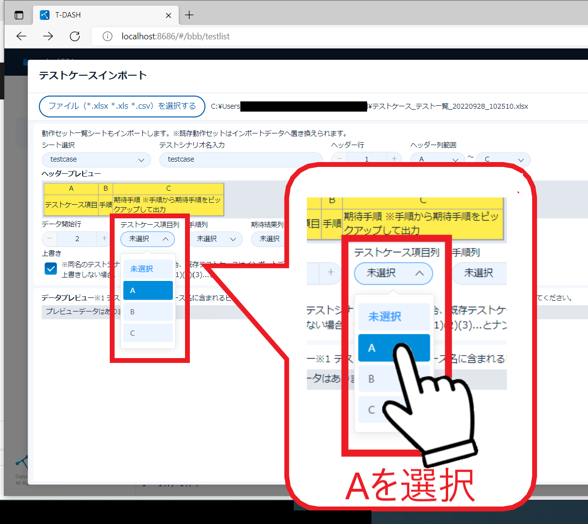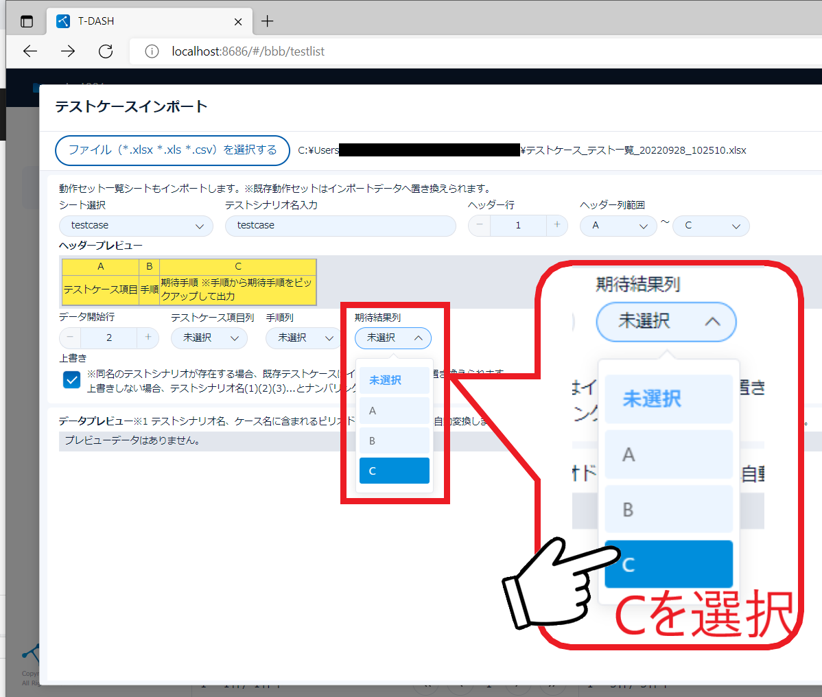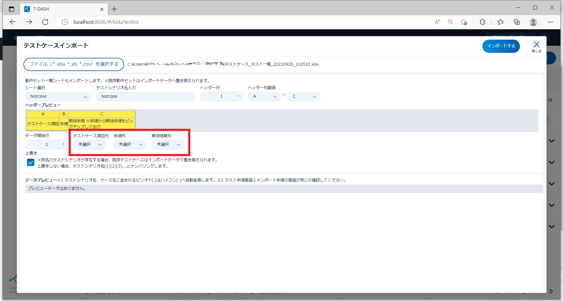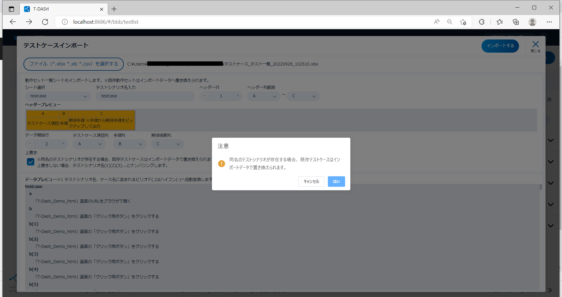 (同名のテストスイートが存在する場合、 既存テストケースはインポートデータで置き換えられます)
