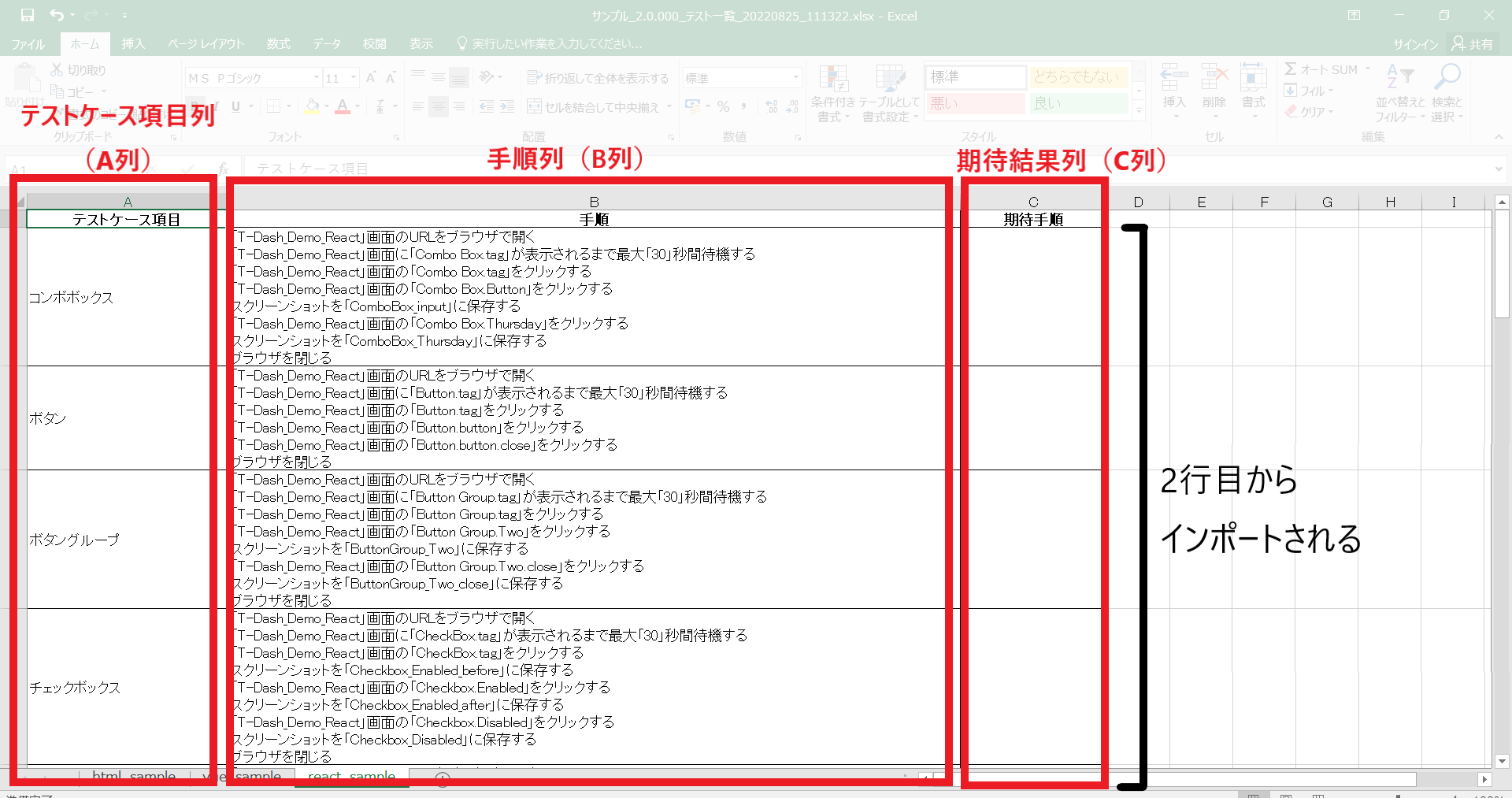 テストケース項目列(A列)、手順列(B列)、期待結果列(C列)をそれぞれ選択する