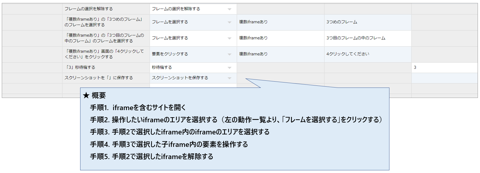 iframeエリアの中にさらにiframeエリアがある場合にも、「フレームを選択する」を使用することで操作可能となります。