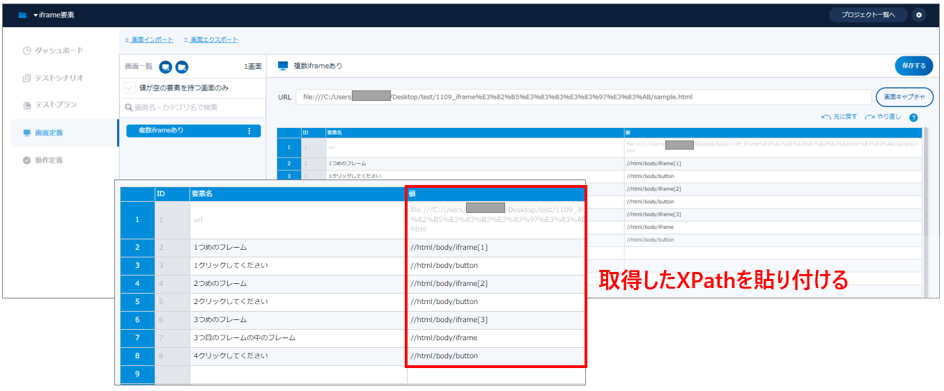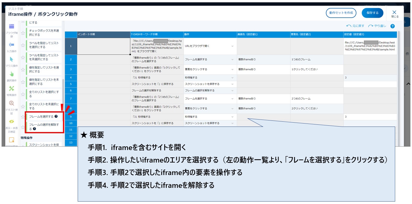 T-DASHでは、iframeの要素に対し、通常とは異なる手順で自動テストが可能となります。