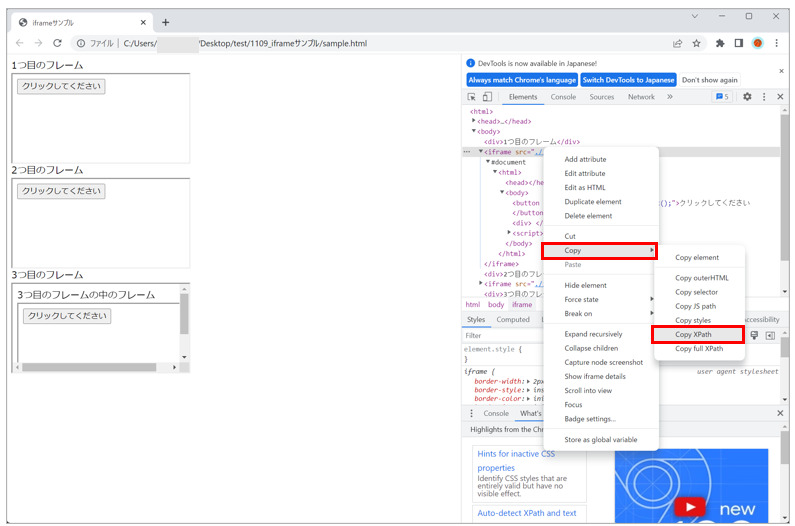 iframe内の要素のXPathを取得する