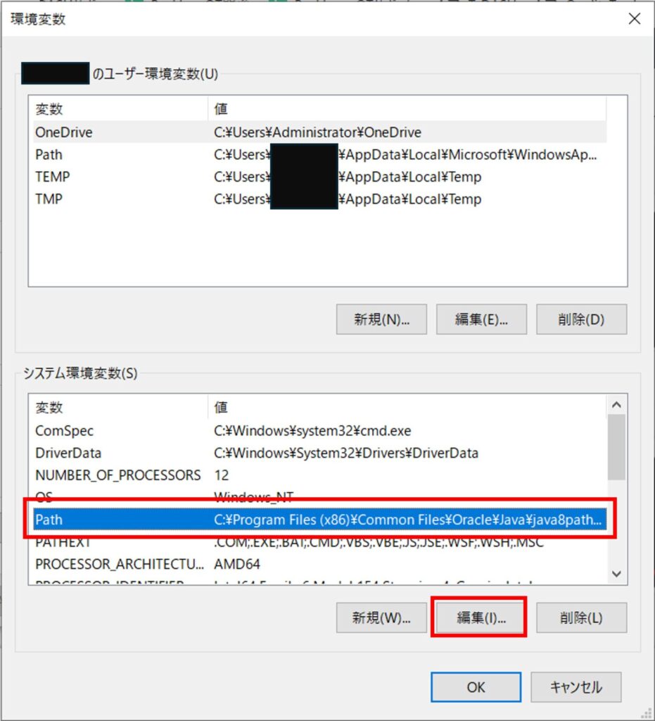 「システム環境変数」の「Path」を選択して、「編集」をクリック