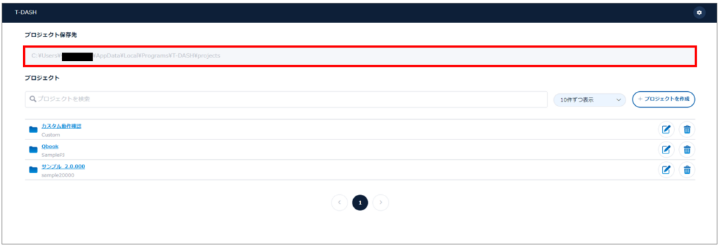 ※インストール先によってパスは異なります、ダッシュボードからT-DASHのプロジェクト保存先をご確認ください。
