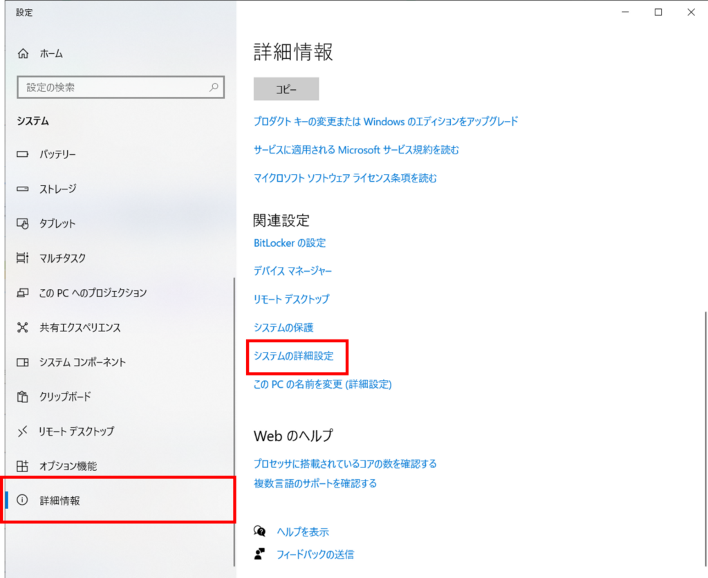 「コントロールパネル」で「システム」⇒「詳細情報」⇒「システムの詳細設定」を選択する。