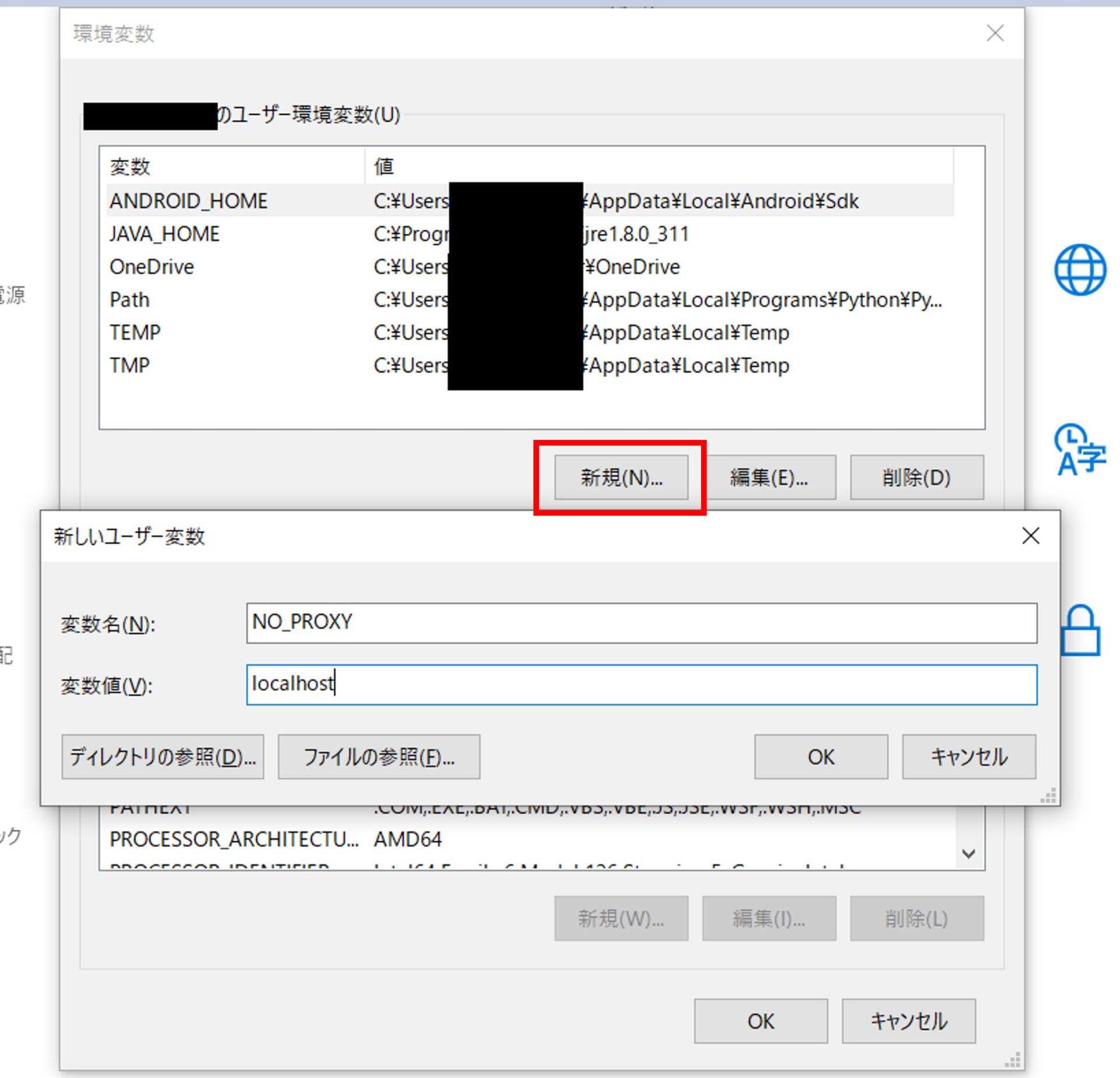 ユーザー環境変数の「新規」をクリックして、変数名「NO_PROXY」、変数値「localhost」 を追加し、