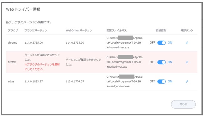 手動でWebドライバーを入手してT-DASHの保存先ディレクトリに上書きしてください