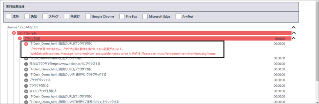 T-DASHで自動テストを実行を試みた時、テストレポートまたはコンソール、ログに「ブラウザが見つかりません。ブラウザを開く動作を実行しておく必要があります。」と表示され、テストが実行できないことがあります。