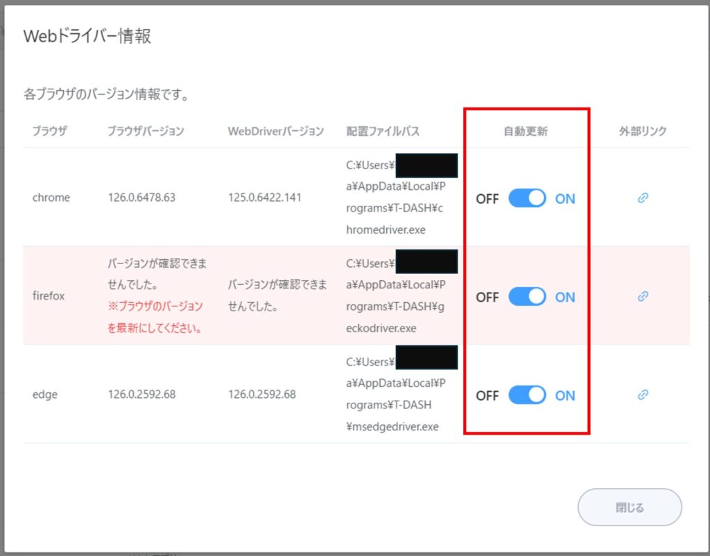 - インストールしていないブラウザについてはWebドライバーの自動更新をOFFにしてください