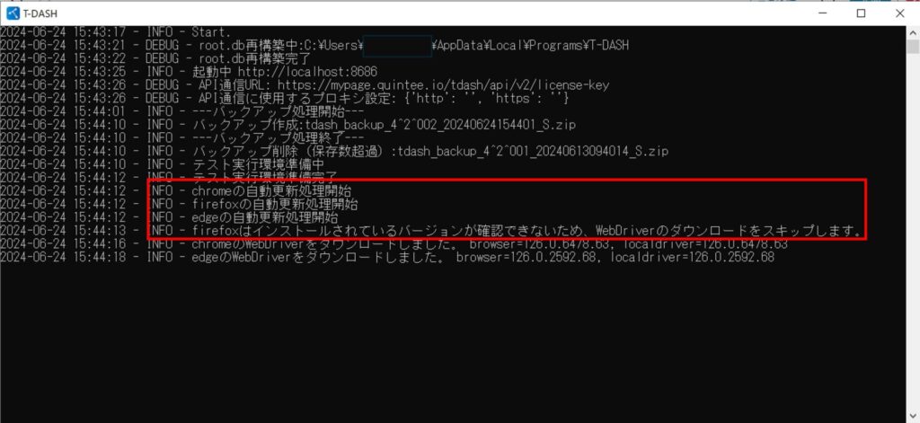 - T-DASHは各種ブラウザのバージョンとWebドライバーのバージョンをチェックするためにレジストリおよびフォルダを参照しています。そのため、インストールされていないブラウザがある場合、以下のようなログがコンソールに出力されることがありますが