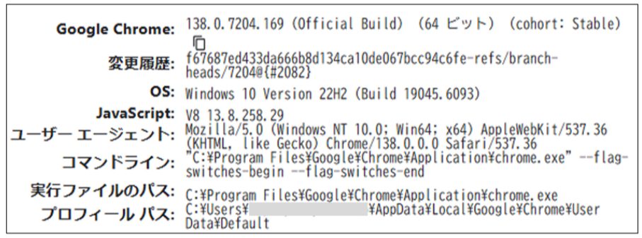 現在のブラウザバージョン情報などを確認するため、Chromeで以下URLを開き、参考画像のような形でスクリーンショットを取得・ご提供ください。